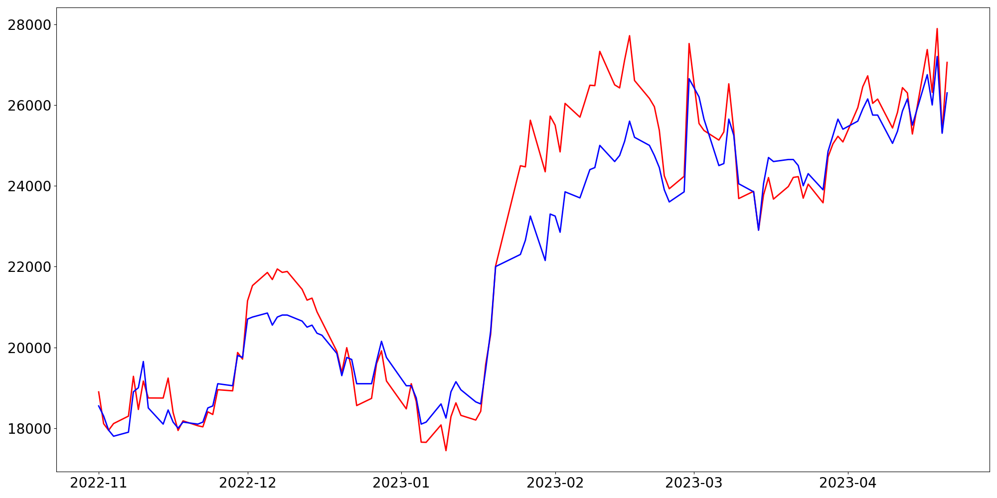 [ - : 실제값(종가) / - : 예측값(종가) ]