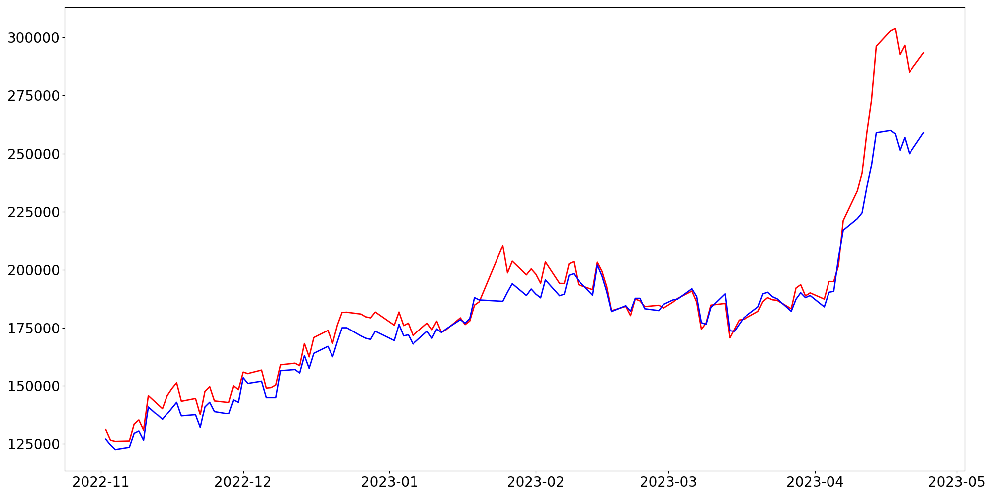 [ - : 실제값(종가) / - : 예측값(종가) ]