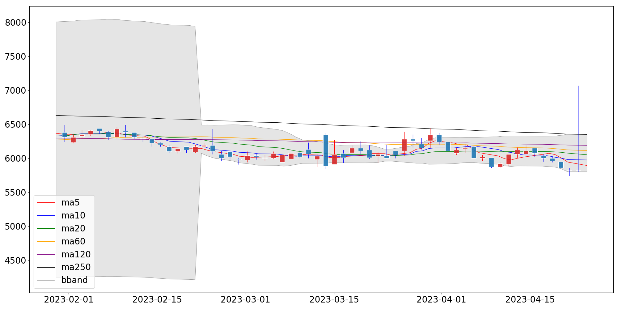 □ 중기 : 현재 종가가 중기(60일) 이동평균값(6,112원)을 하회 하여 중기적 추세 하락 중