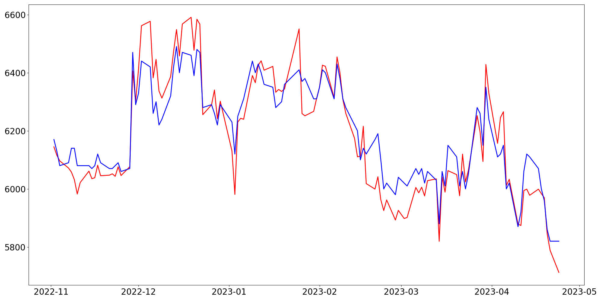 [ - : 실제값(종가) / - : 예측값(종가) ]