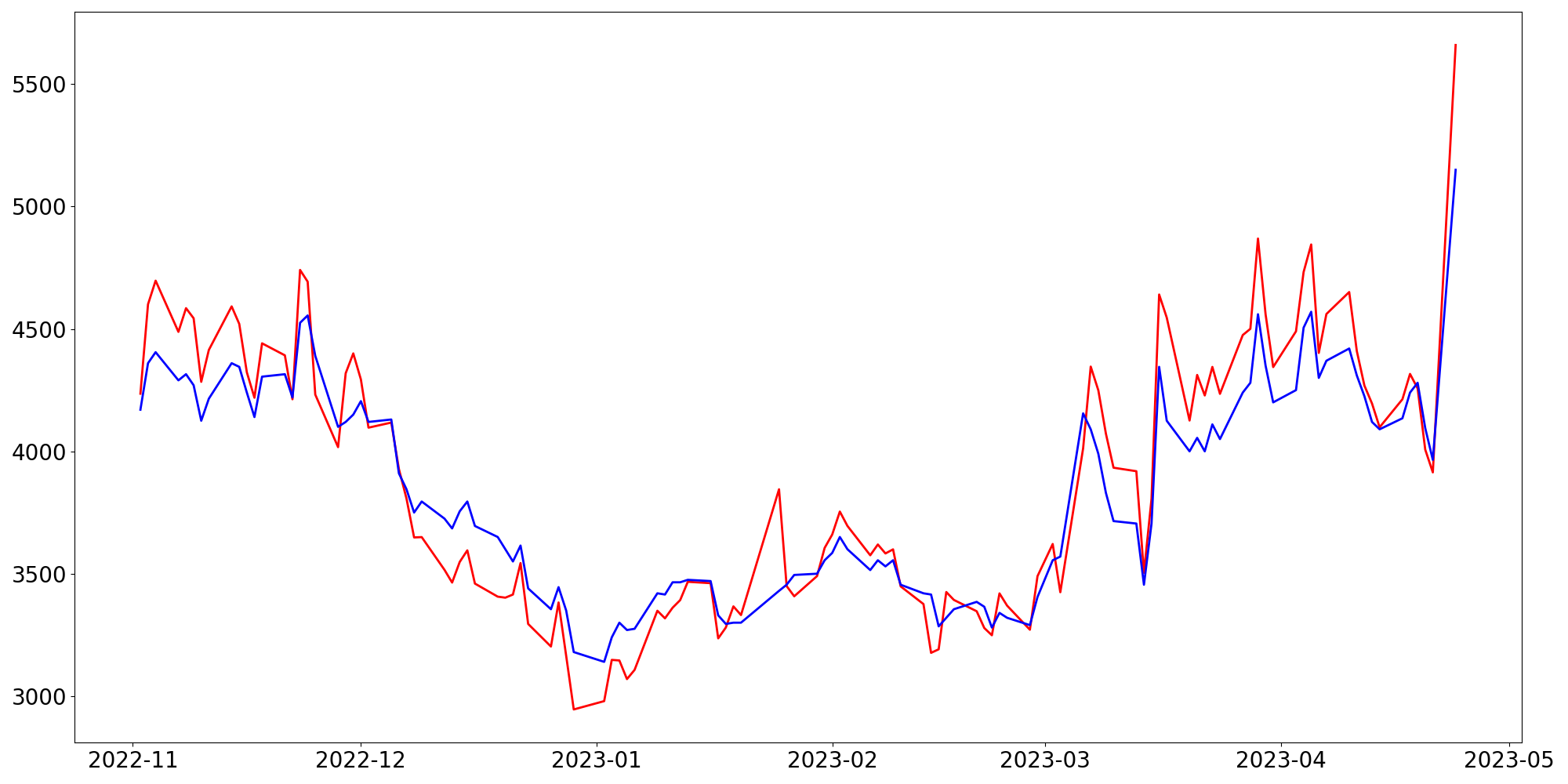 [ - : 실제값(종가) / - : 예측값(종가) ]
