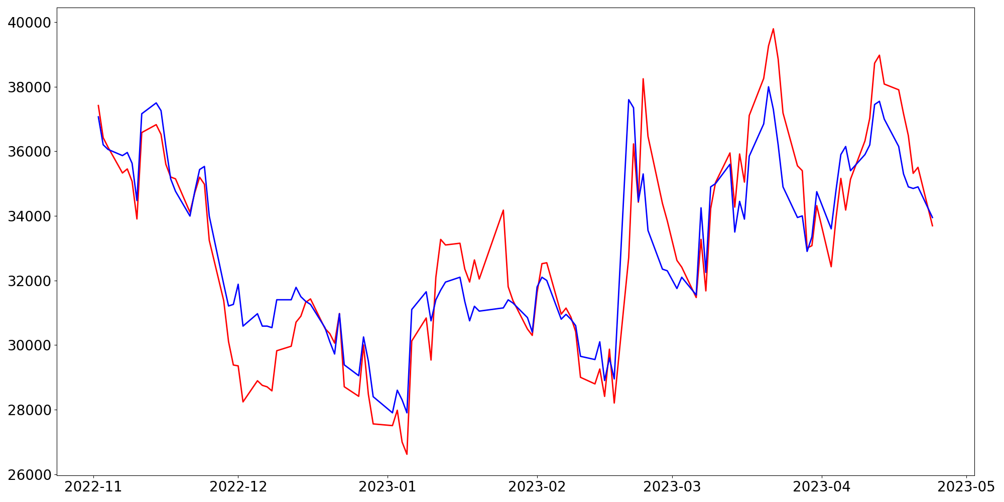 [ - : 실제값(종가) / - : 예측값(종가) ]