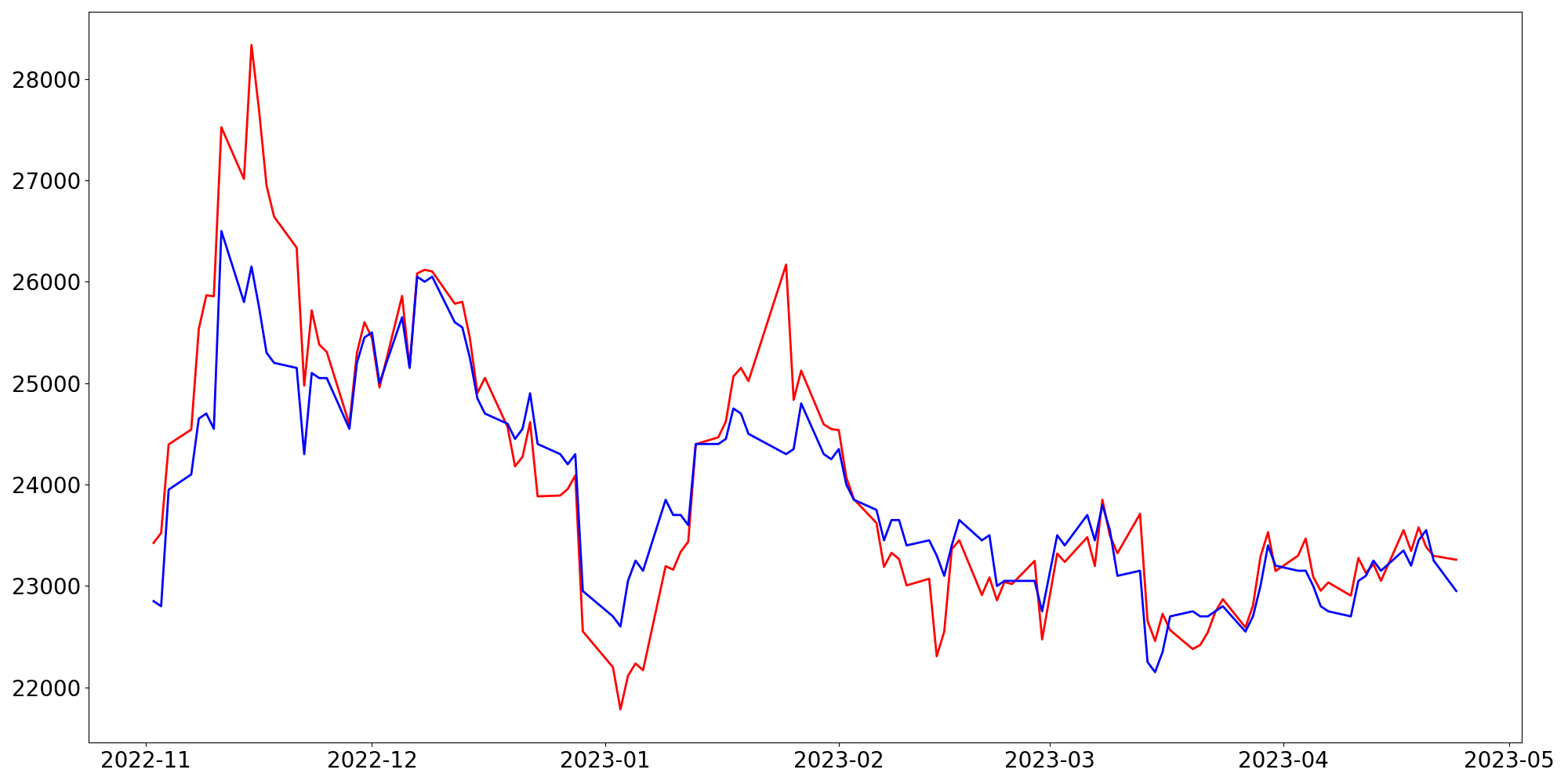 [ - : 실제값(종가) / - : 예측값(종가) ]