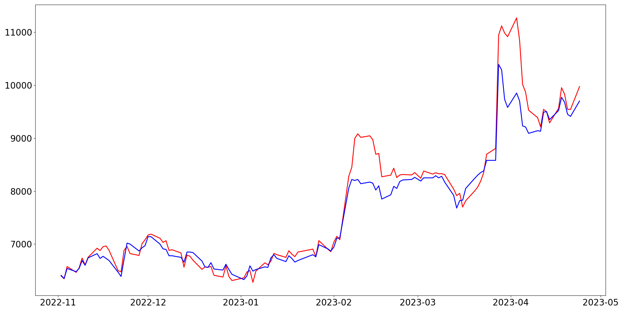 [ - : 실제값(종가) / - : 예측값(종가) ]