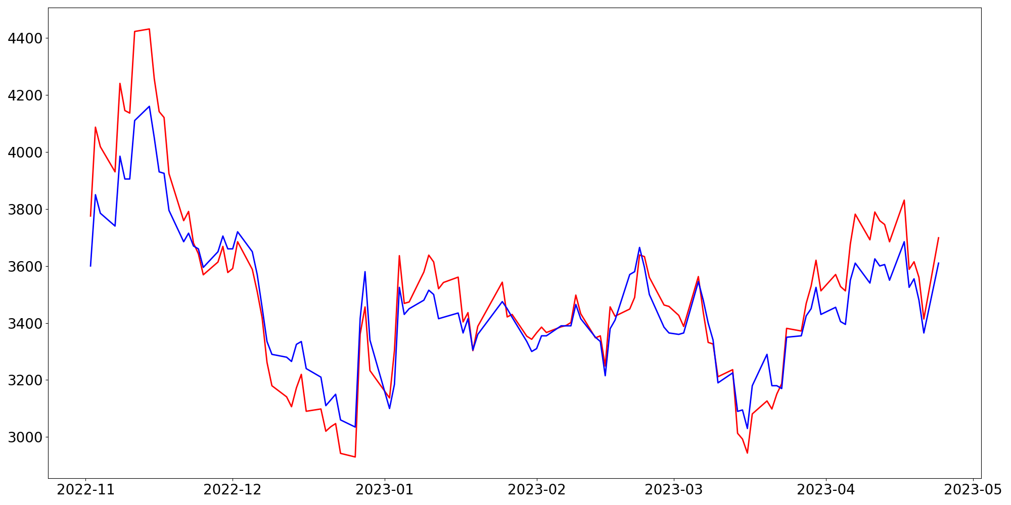 [ - : 실제값(종가) / - : 예측값(종가) ]