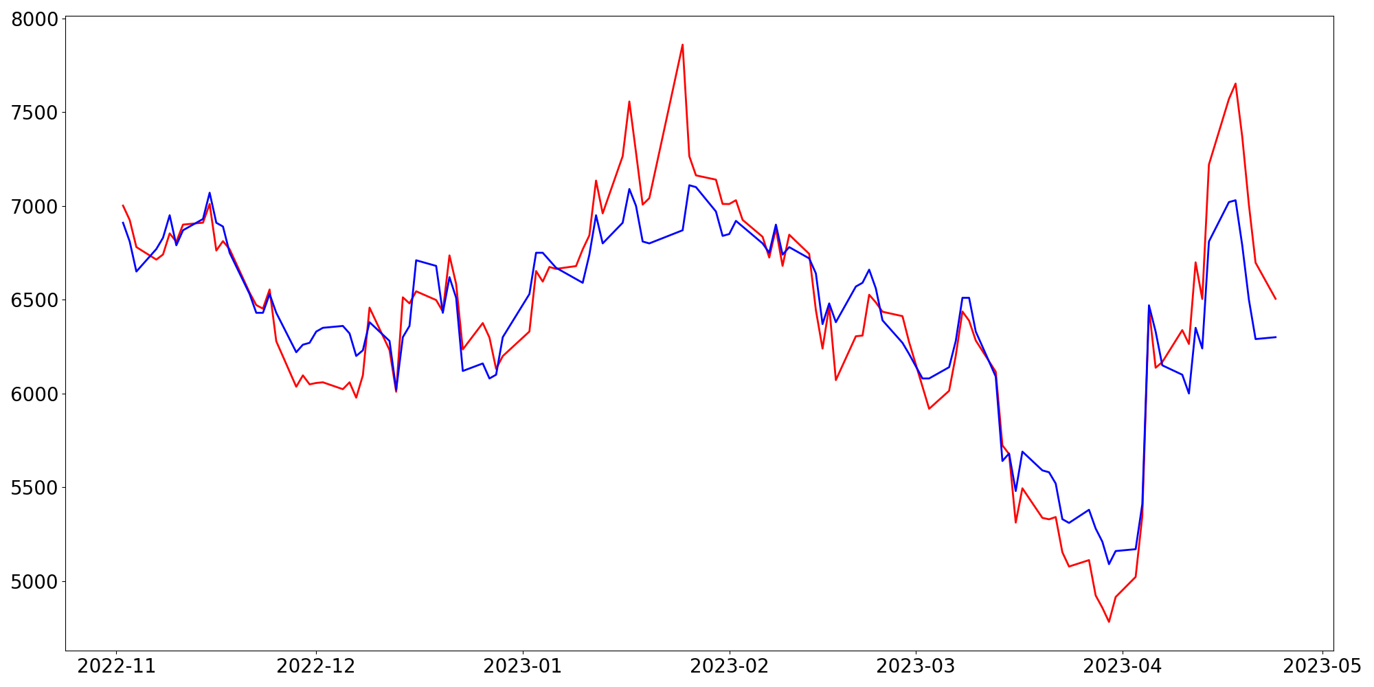 [ - : 실제값(종가) / - : 예측값(종가) ]