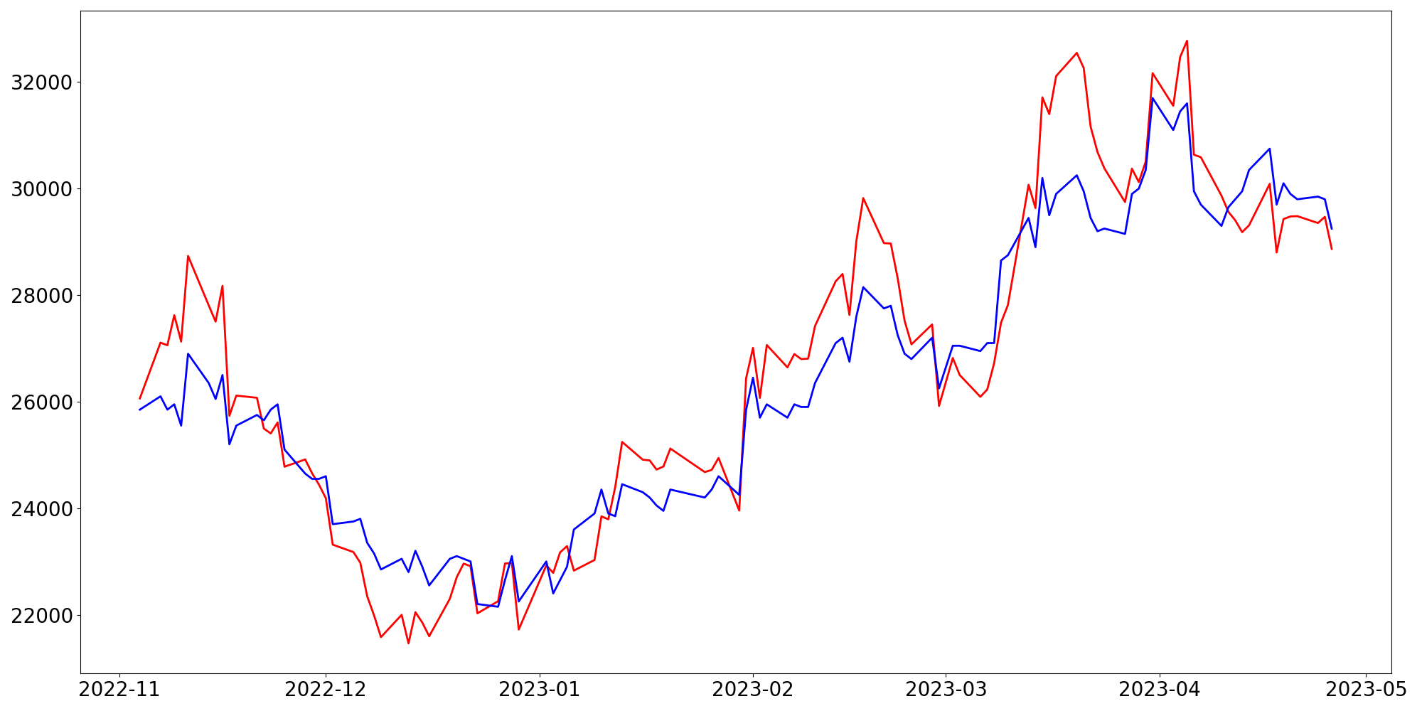 [ - : 실제값(종가) / - : 예측값(종가) ]
