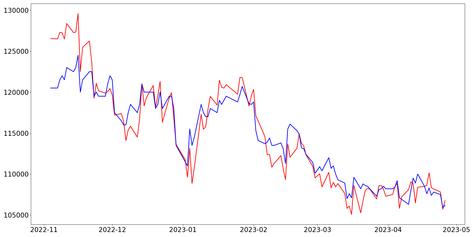 [ - : 실제값(종가) / - : 예측값(종가) ]