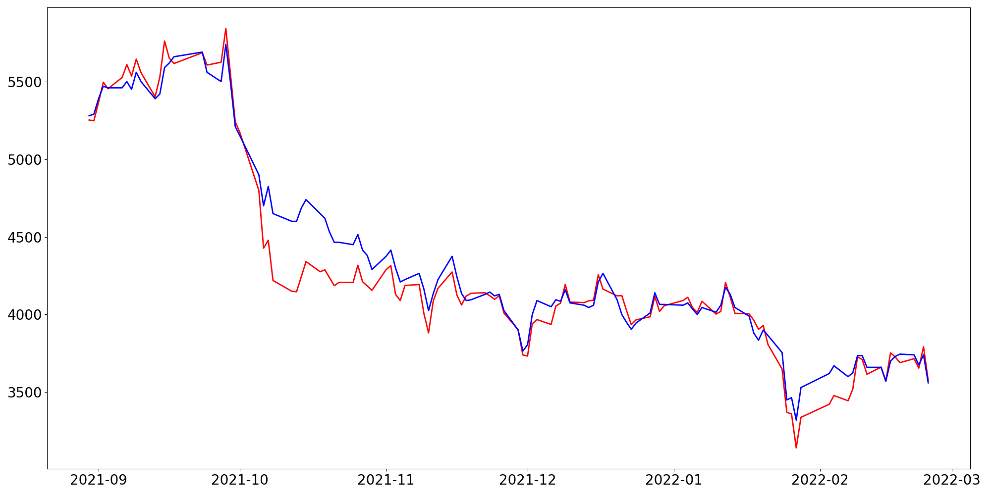 [ - : 실제값(종가) / - : 예측값(종가) ]