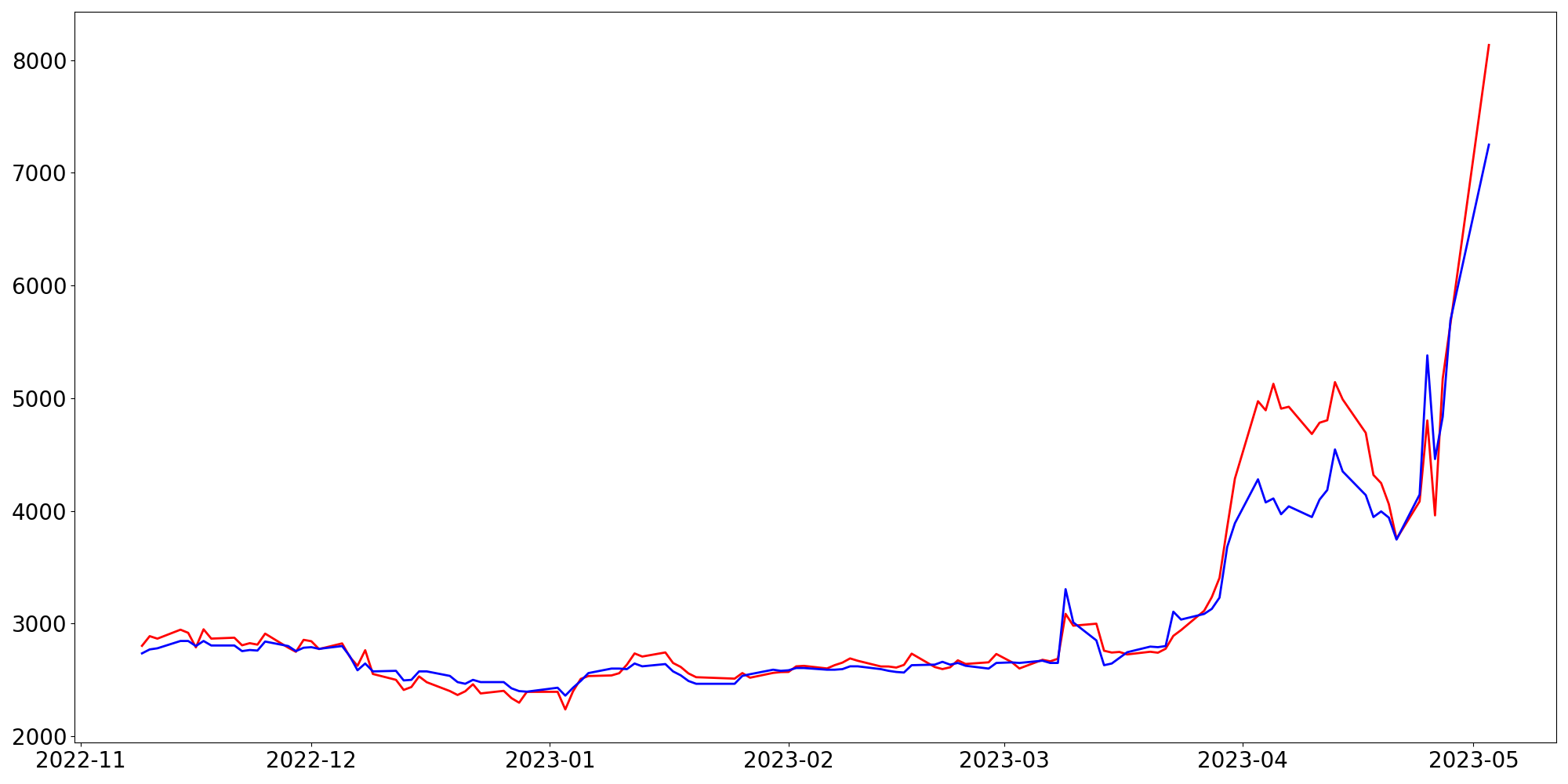 [ - : 실제값(종가) / - : 예측값(종가) ]