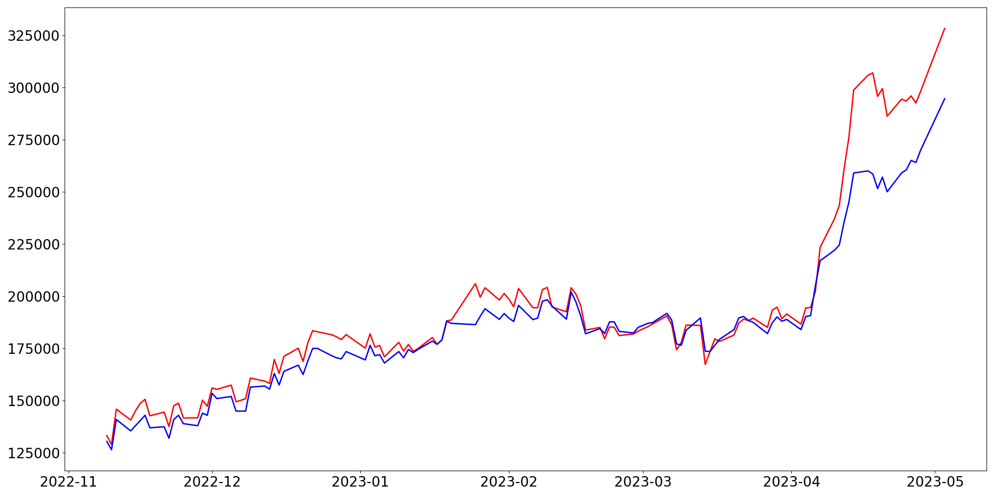 [ - : 실제값(종가) / - : 예측값(종가) ]