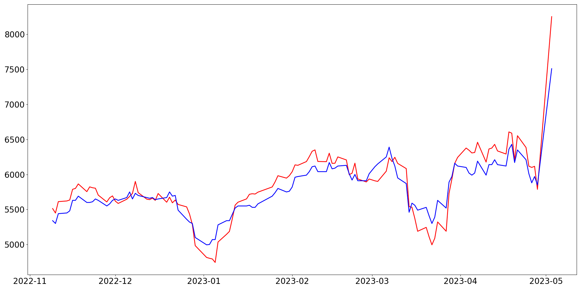[ - : 실제값(종가) / - : 예측값(종가) ]