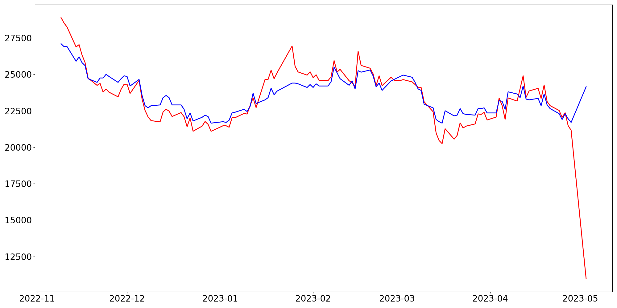 [ - : 실제값(종가) / - : 예측값(종가) ]