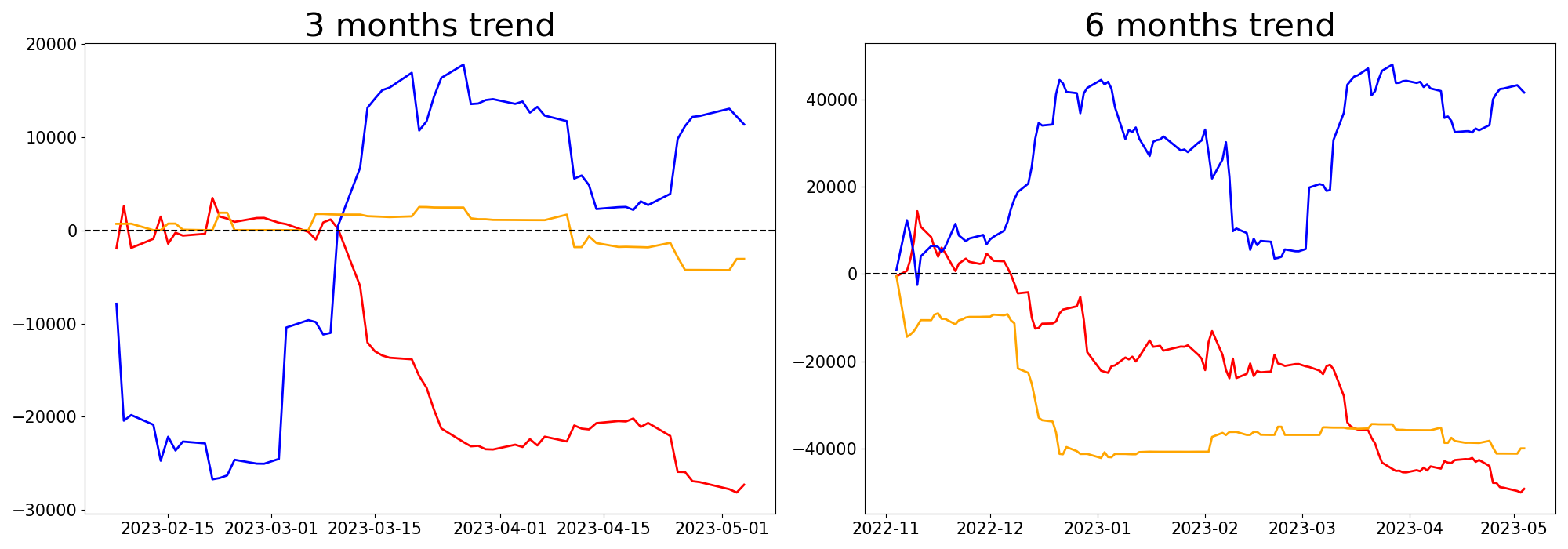 기관, 개인, 외국인으로 분류하여 투자주체별 일정기간동안의 누적적 매수/매도 현황을 분석한 내용입니다. 특정일의 투자자별 매매동향을 통해서 단기간의 시장충격여부를 판단할 수 있으며 장기적인 매매동향을 통해서 해당 종목의 장기 모멘텀을 판단해 볼 수 있습니다.