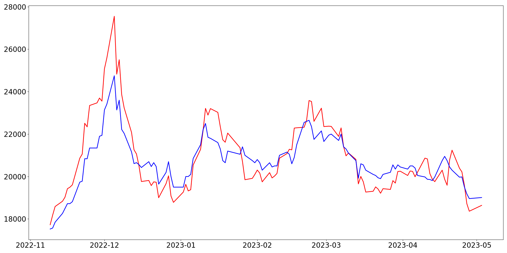 [ - : 실제값(종가) / - : 예측값(종가) ]