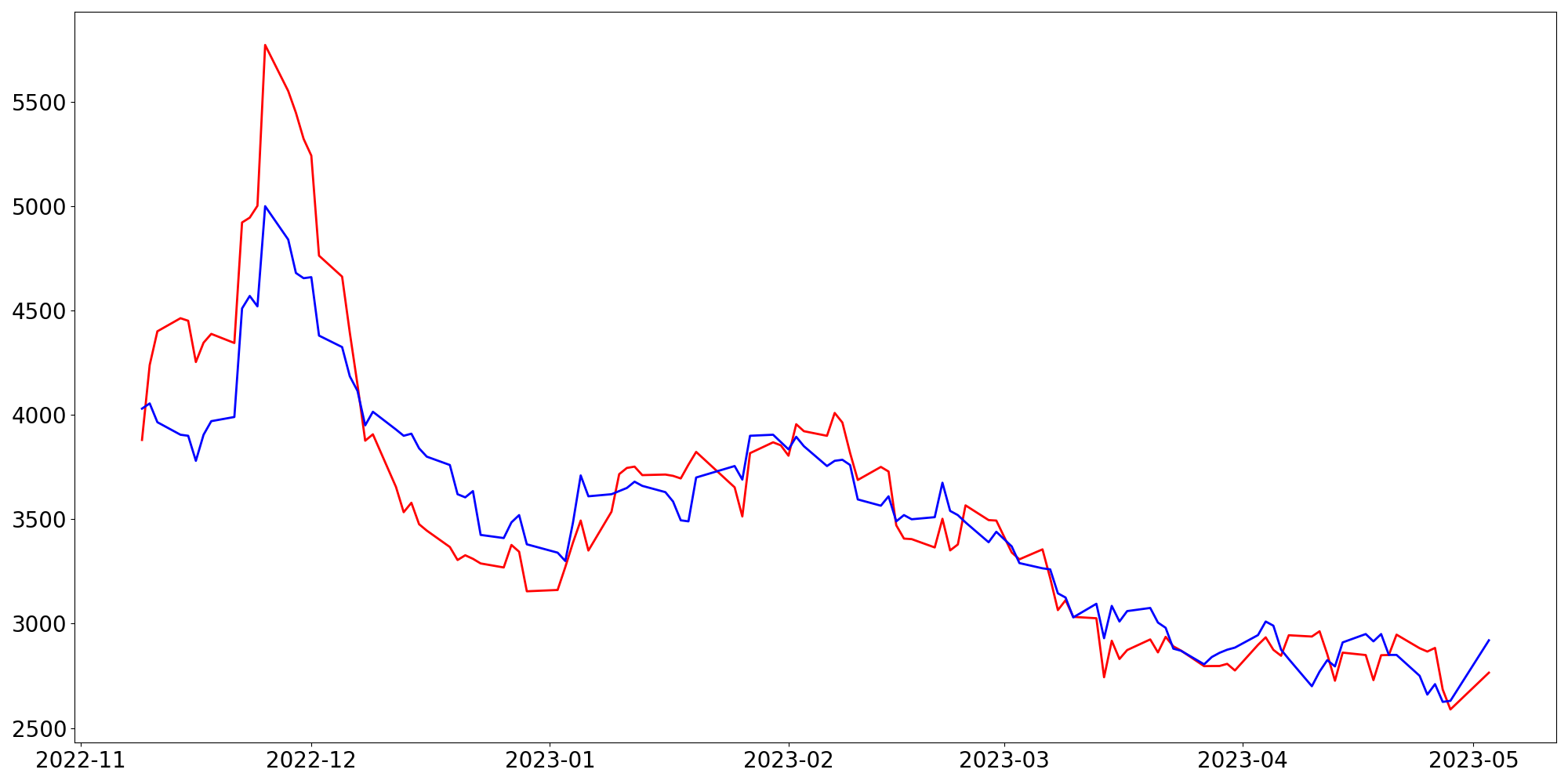 [ - : 실제값(종가) / - : 예측값(종가) ]