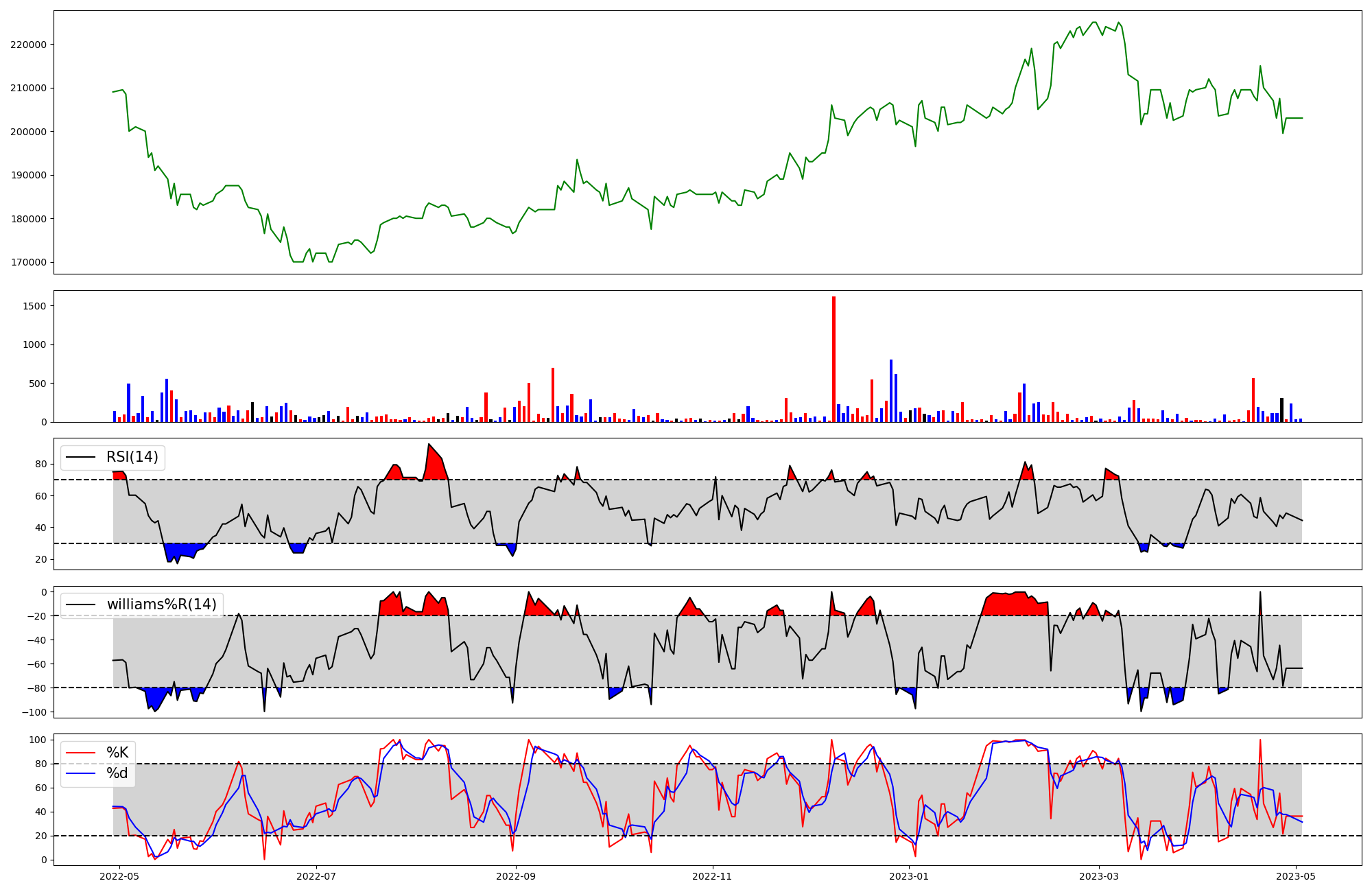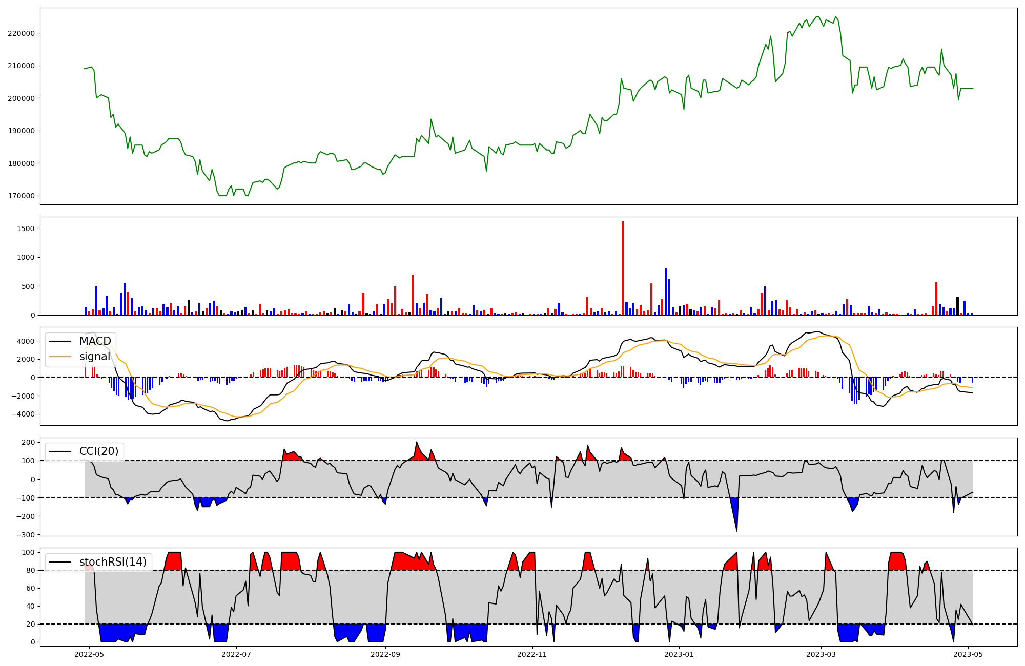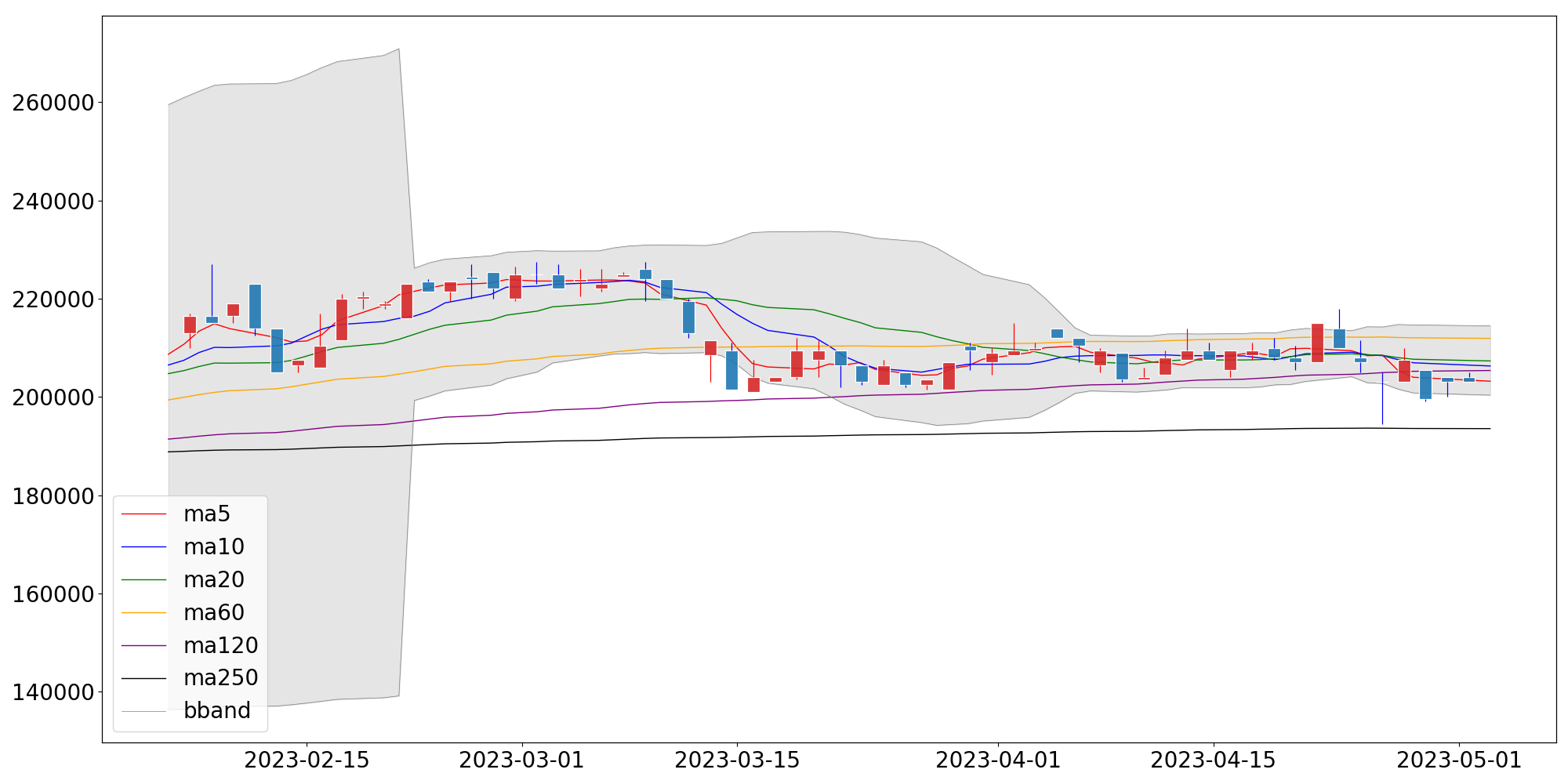 □ 중기 : 현재 종가가 중기(60일) 이동평균값(211,925원)을 하회 하여 중기적 추세 하락 중