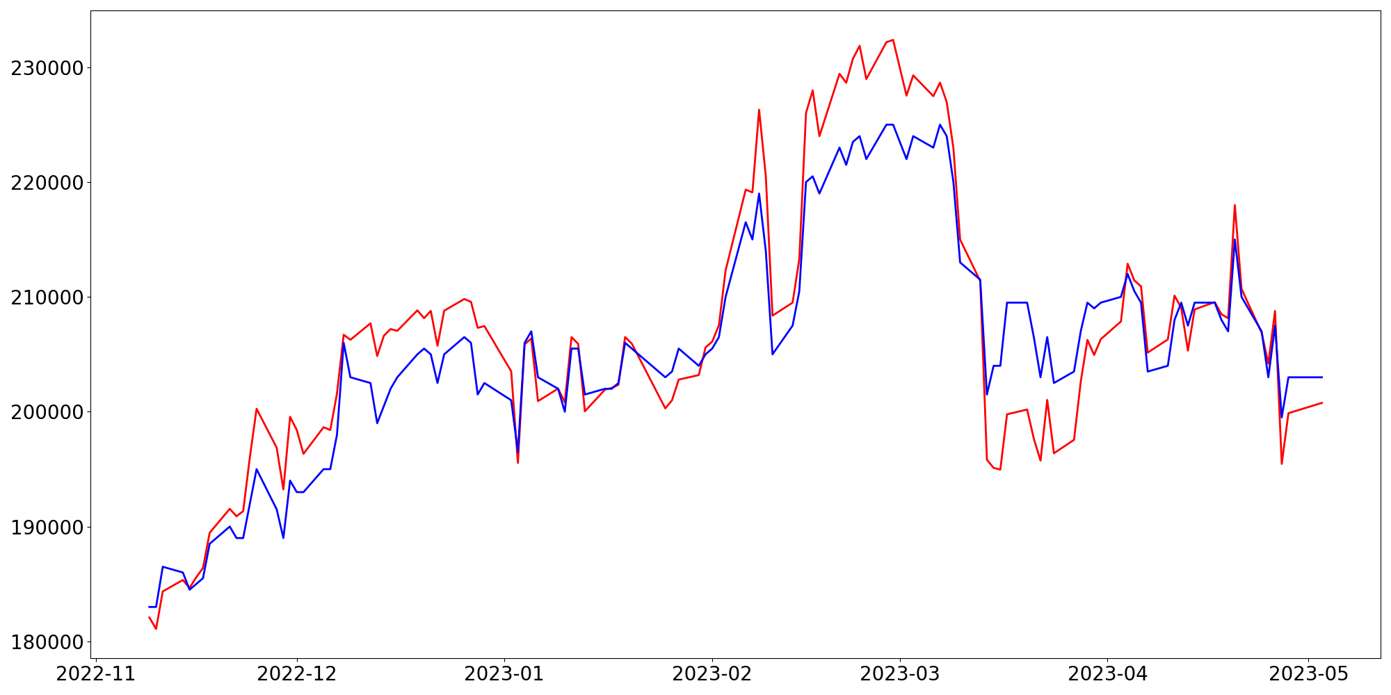 [ - : 실제값(종가) / - : 예측값(종가) ]