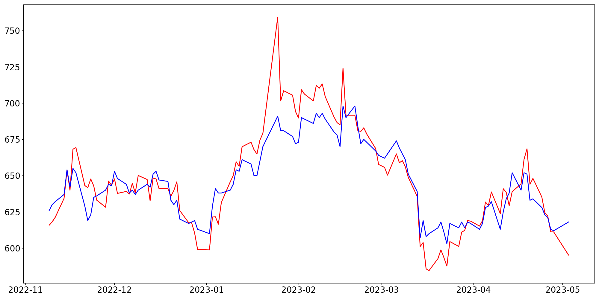 [ - : 실제값(종가) / - : 예측값(종가) ]