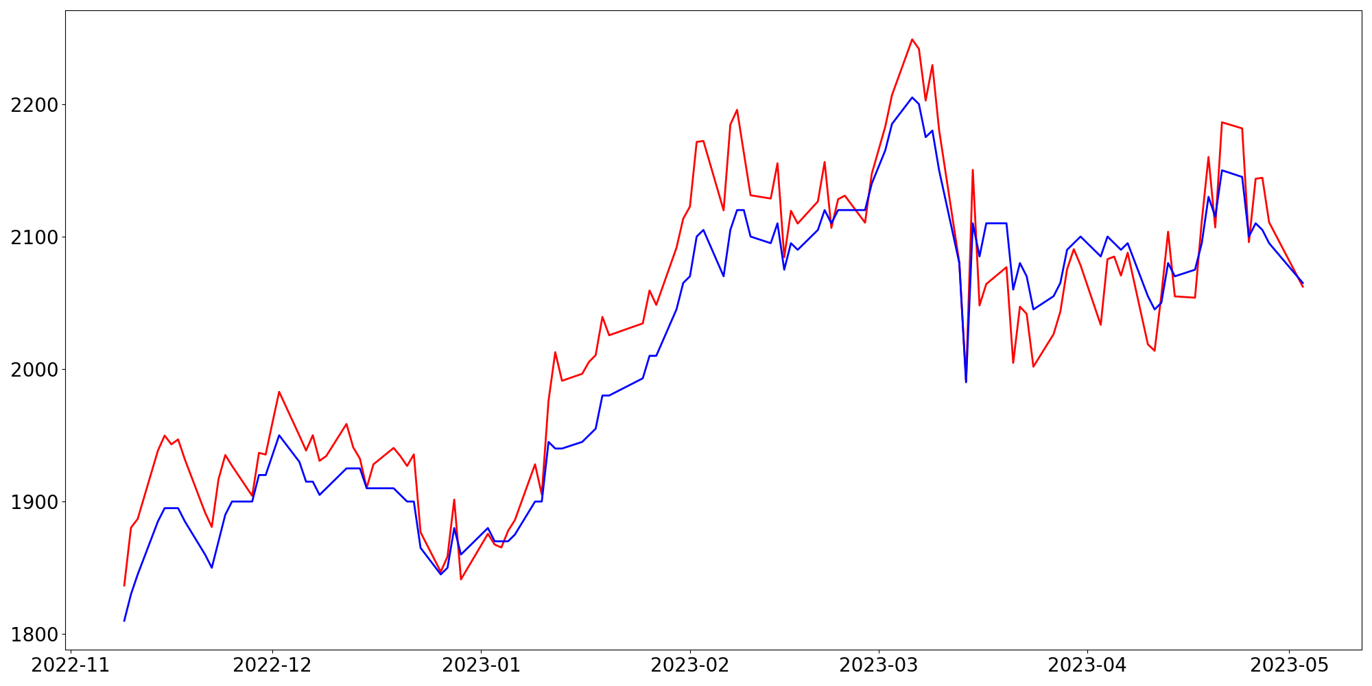 [ - : 실제값(종가) / - : 예측값(종가) ]