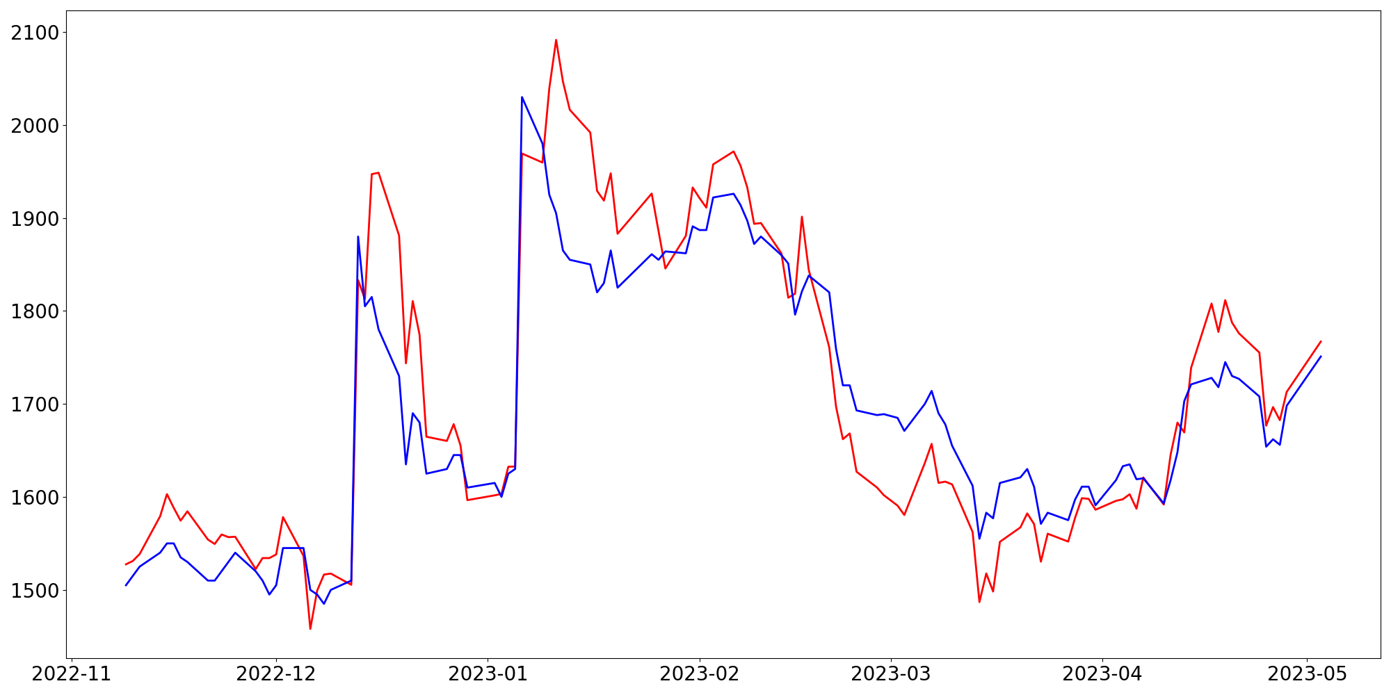 [ - : 실제값(종가) / - : 예측값(종가) ]