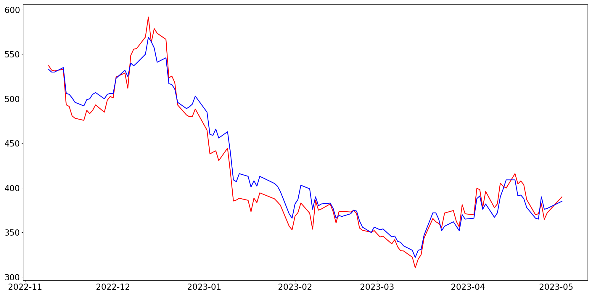 [ - : 실제값(종가) / - : 예측값(종가) ]