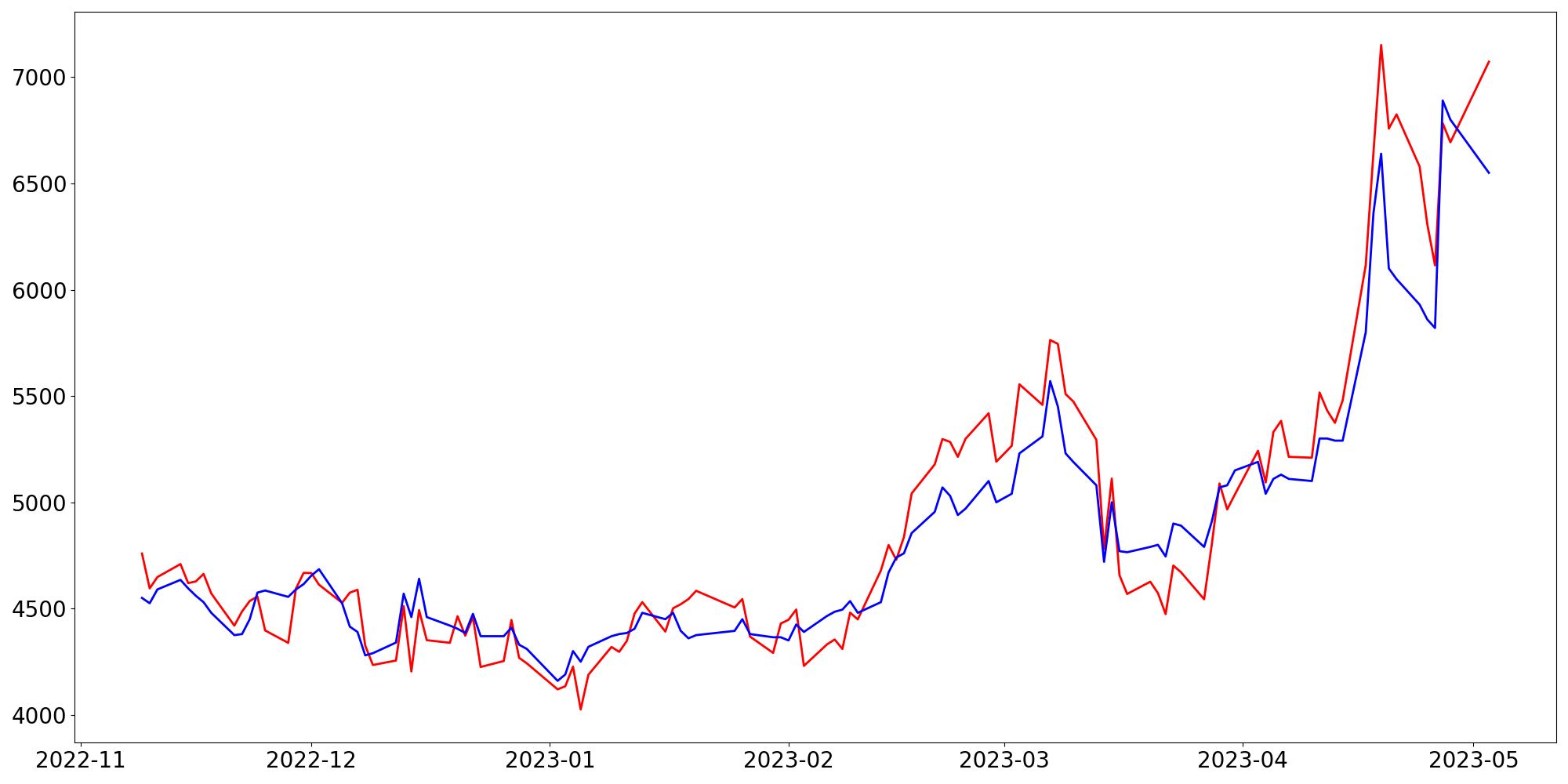 [ - : 실제값(종가) / - : 예측값(종가) ]