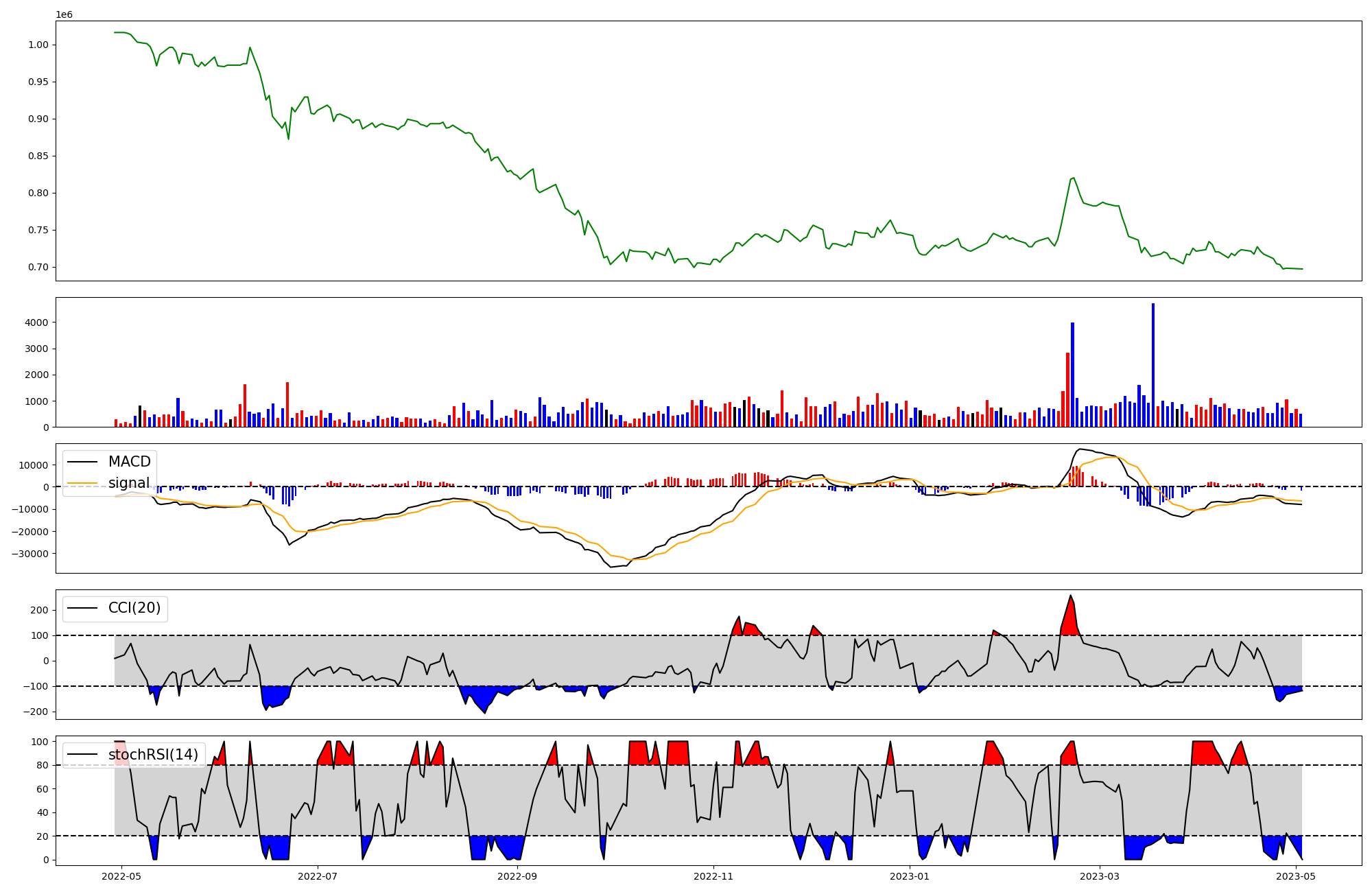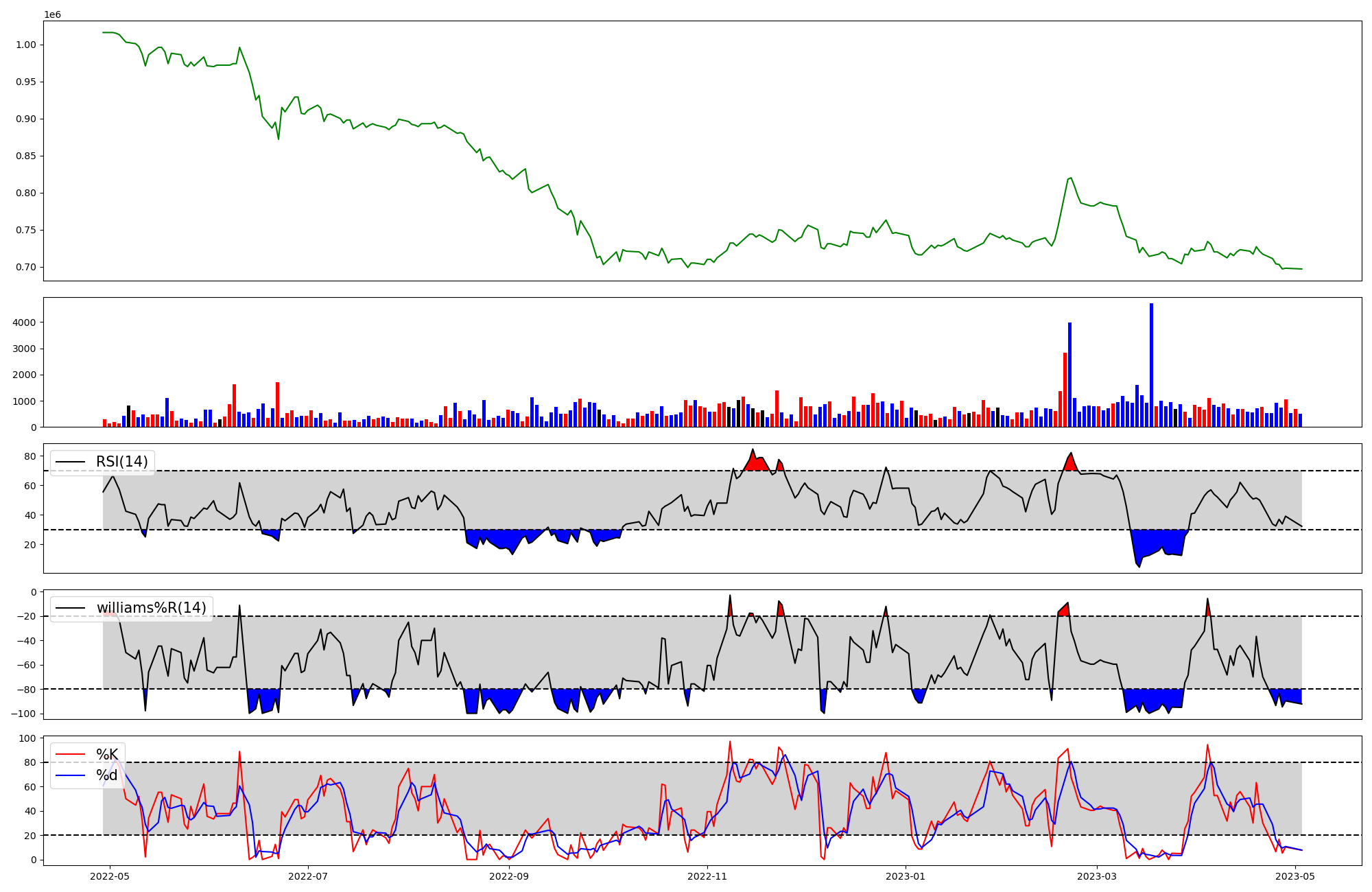 □ 중기 : 현재 종가가 중기(60일) 이동평균값(735,683원)을 하회 하여 중기적 추세 하락 중