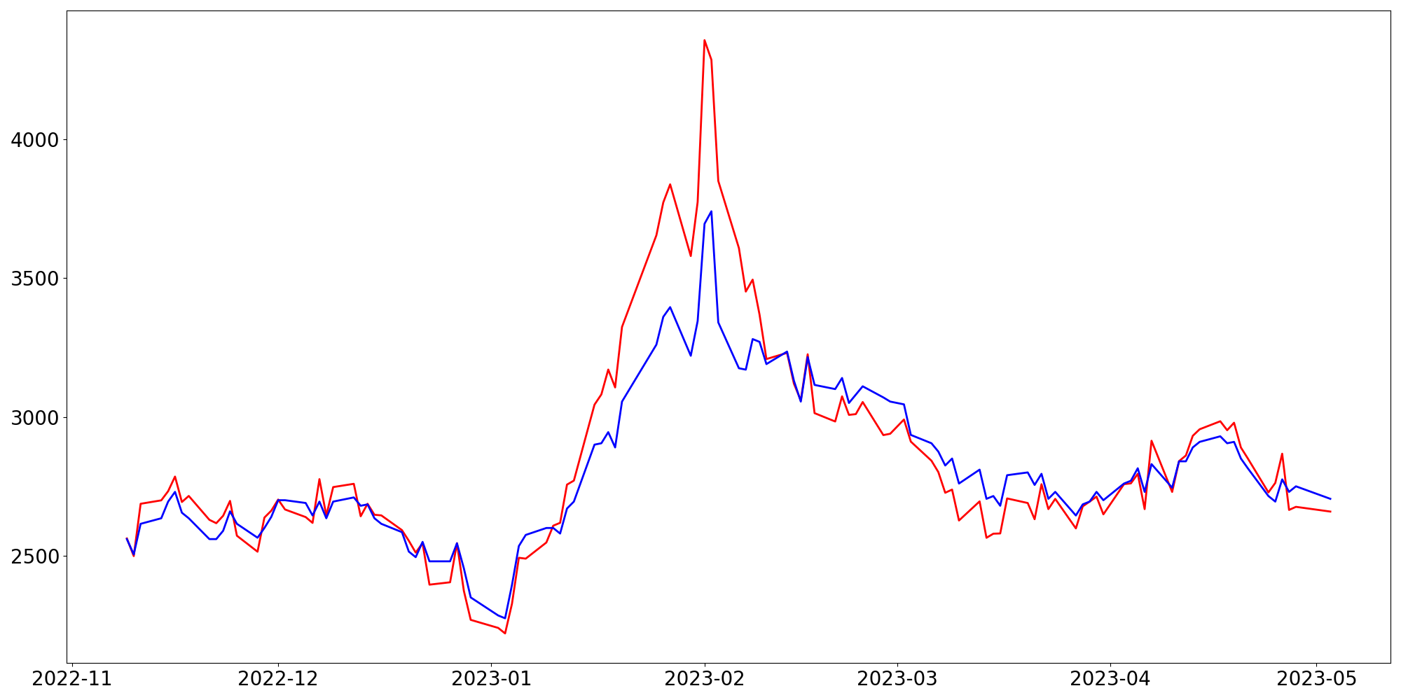 [ - : 실제값(종가) / - : 예측값(종가) ]