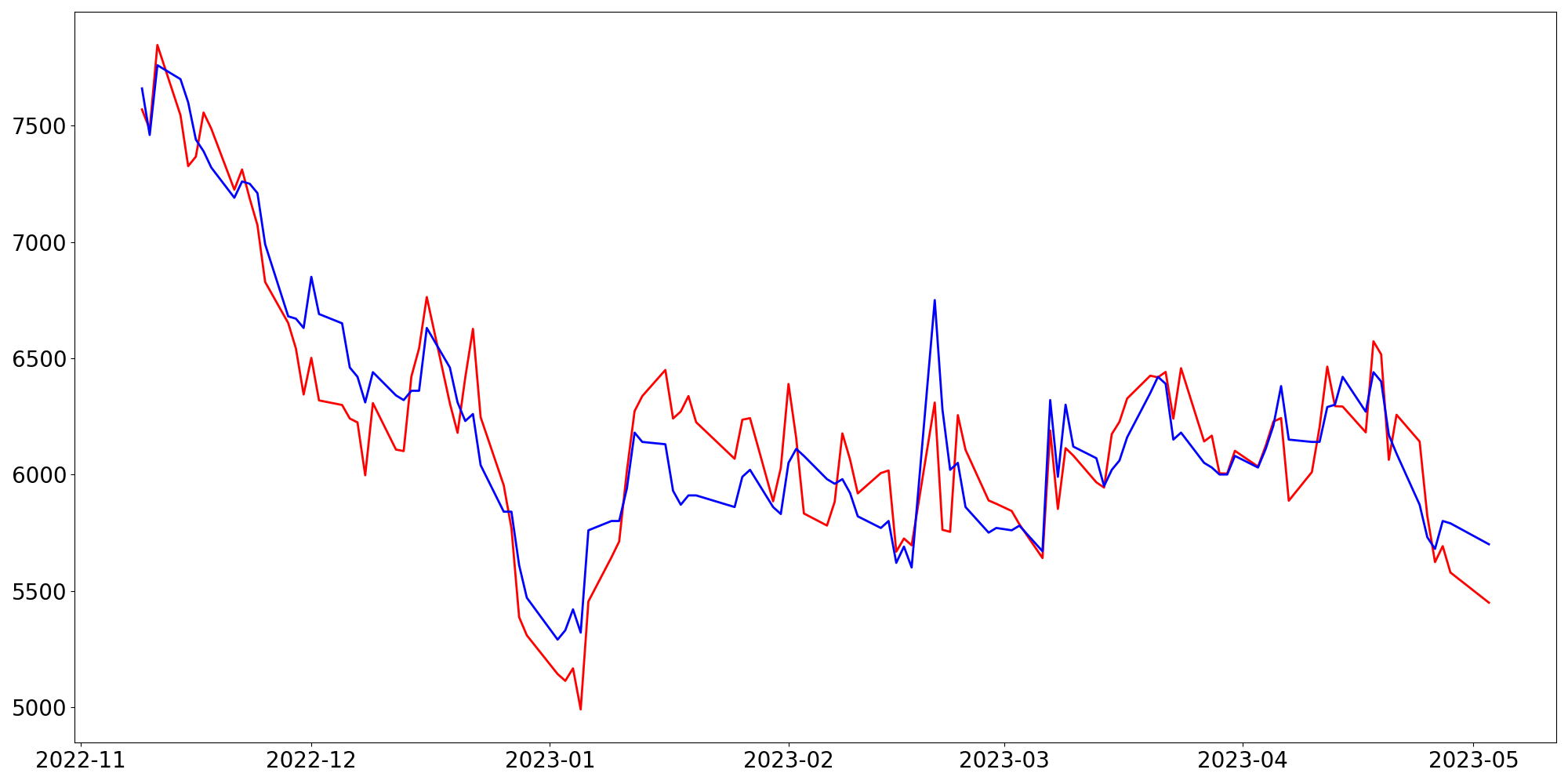 [ - : 실제값(종가) / - : 예측값(종가) ]