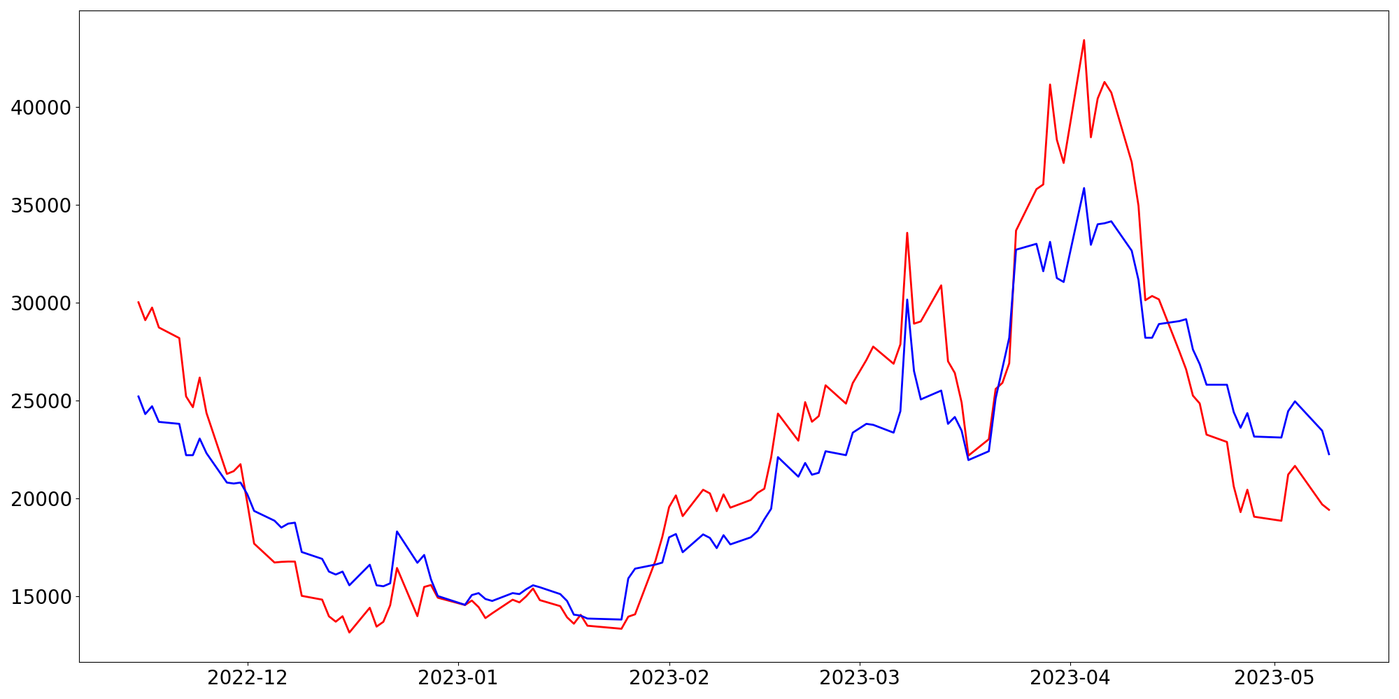 [ - : 실제값(종가) / - : 예측값(종가) ]