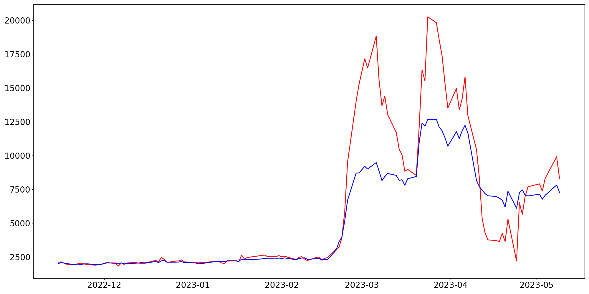 [ - : 실제값(종가) / - : 예측값(종가) ]