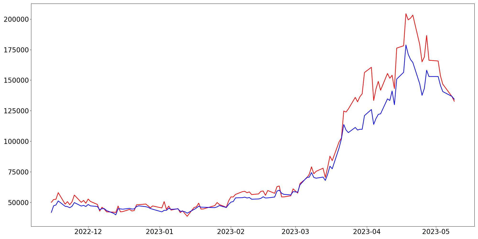 [ - : 실제값(종가) / - : 예측값(종가) ]