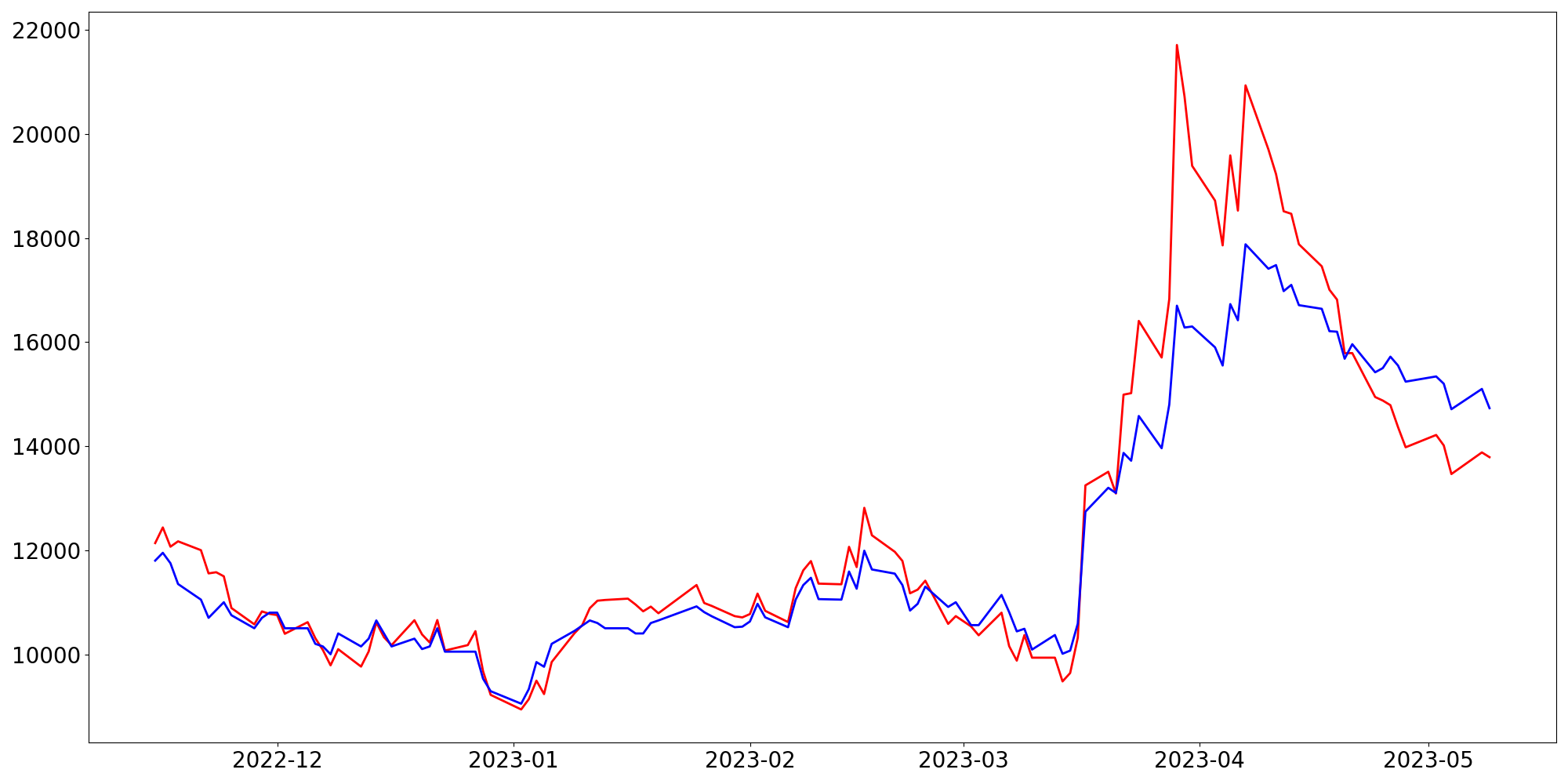 [ - : 실제값(종가) / - : 예측값(종가) ]
