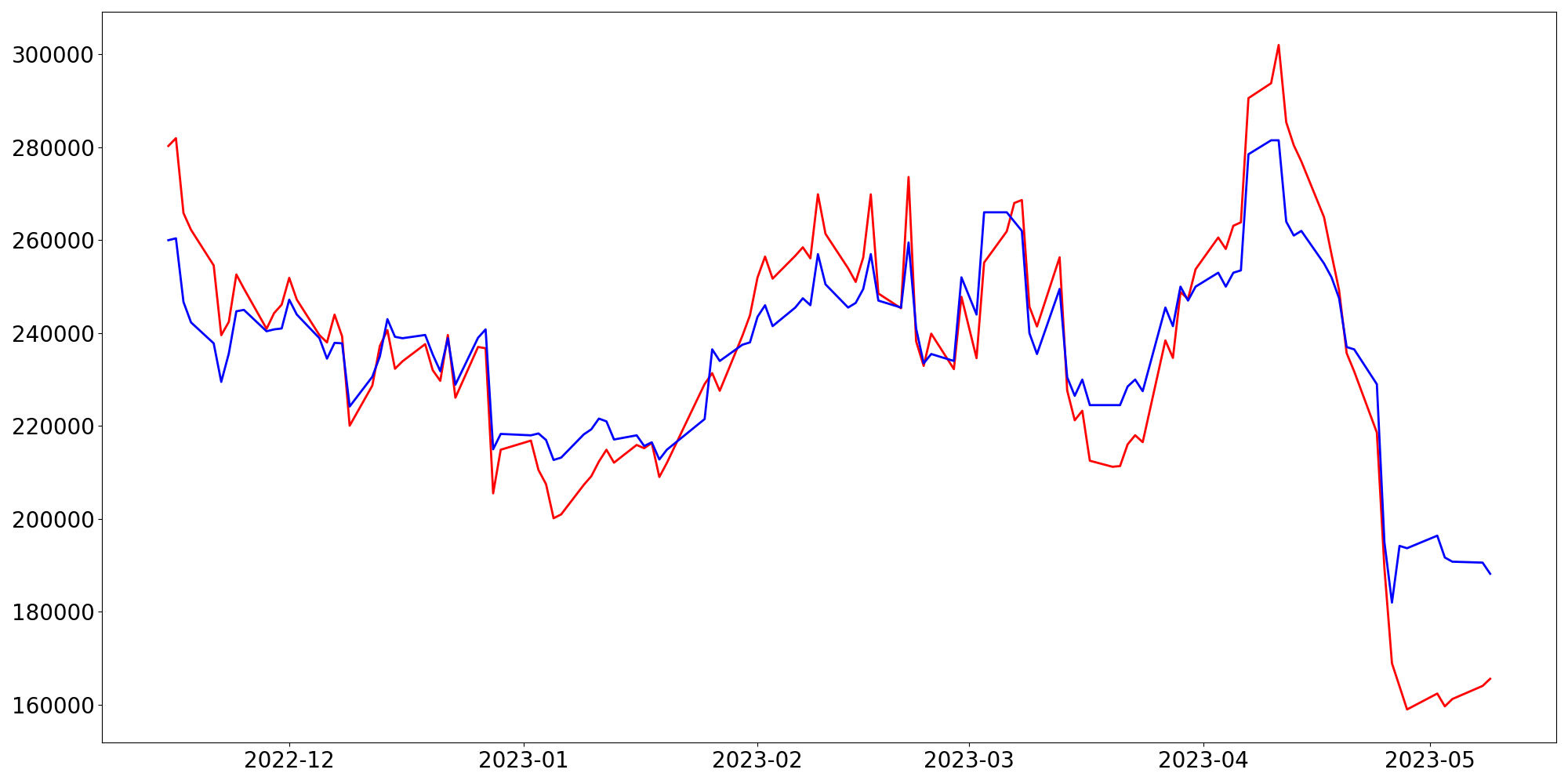 [ - : 실제값(종가) / - : 예측값(종가) ]