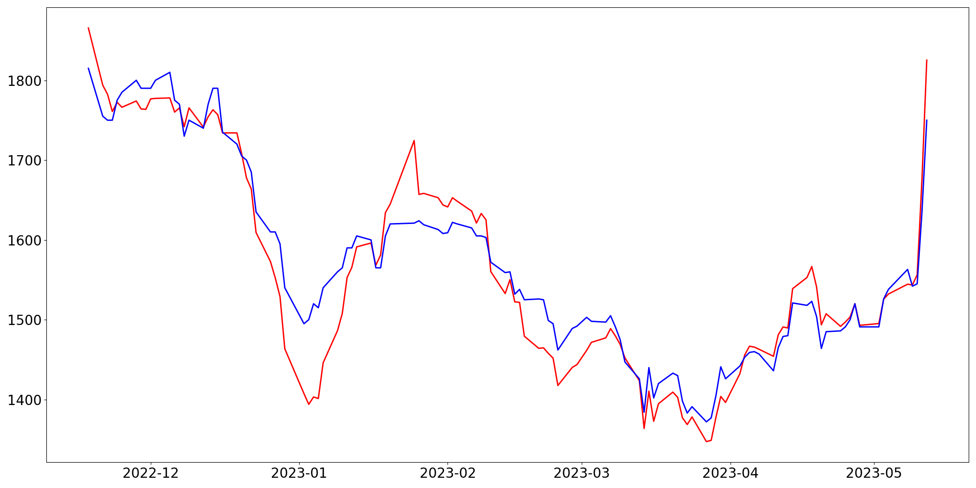 [ - : 실제값(종가) / - : 예측값(종가) ]