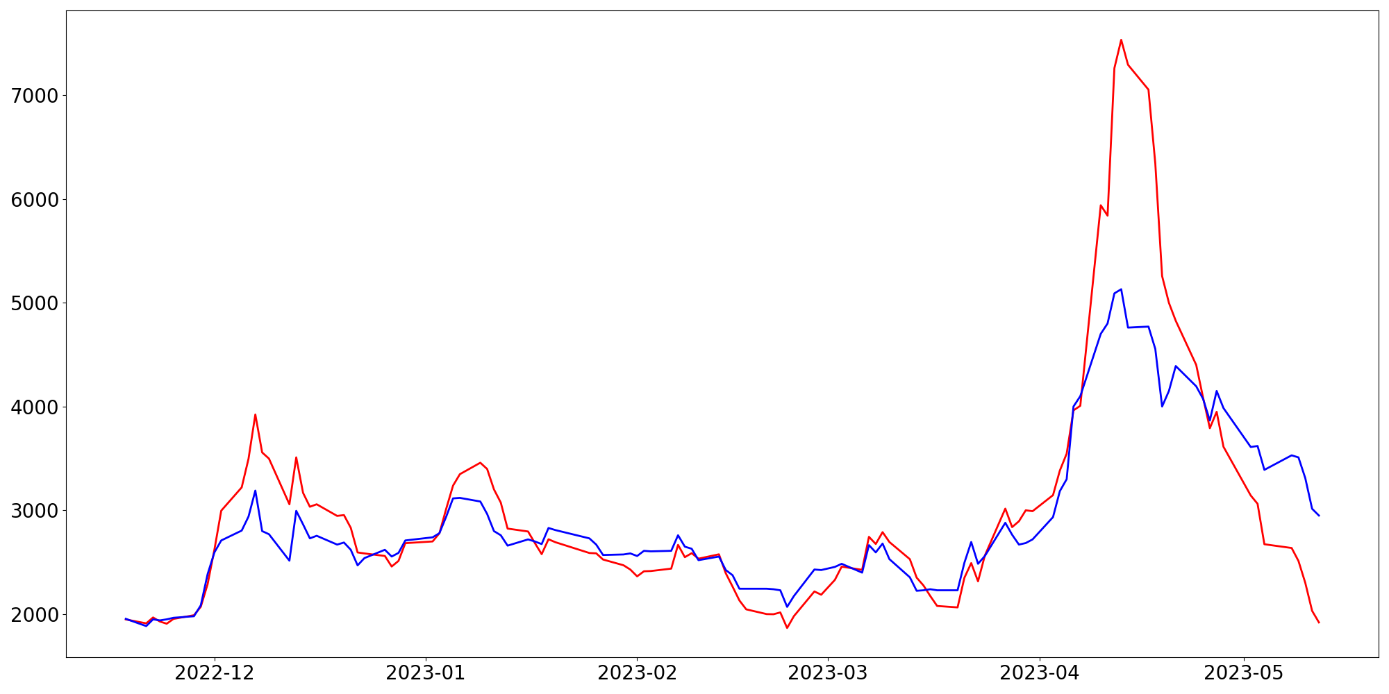[ - : 실제값(종가) / - : 예측값(종가) ]