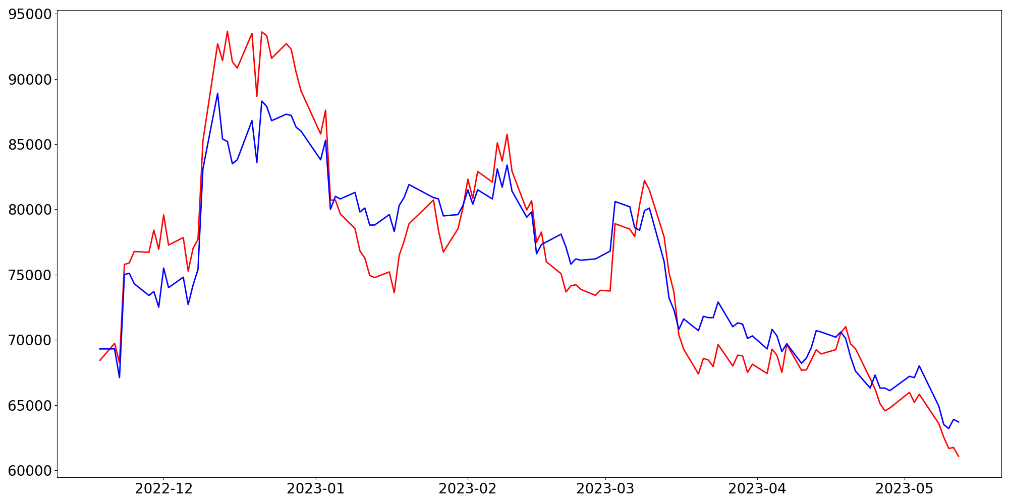 [ - : 실제값(종가) / - : 예측값(종가) ]