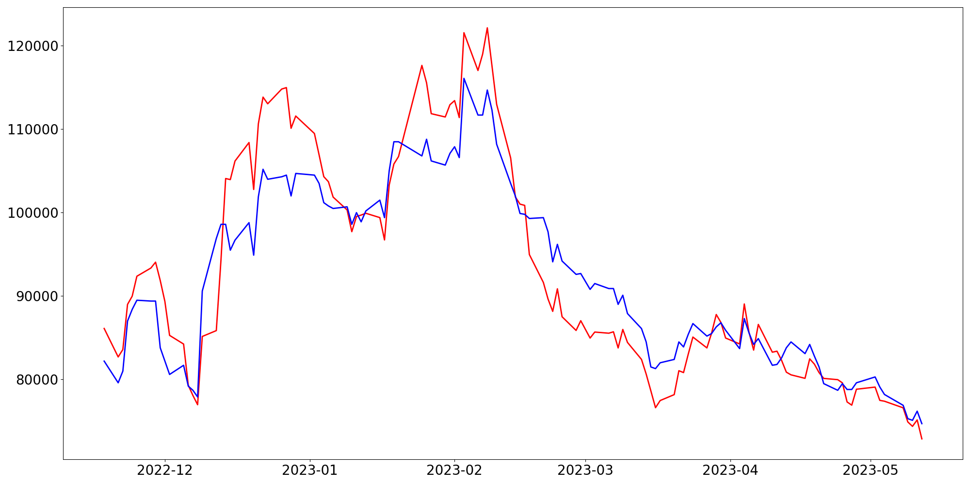 [ - : 실제값(종가) / - : 예측값(종가) ]