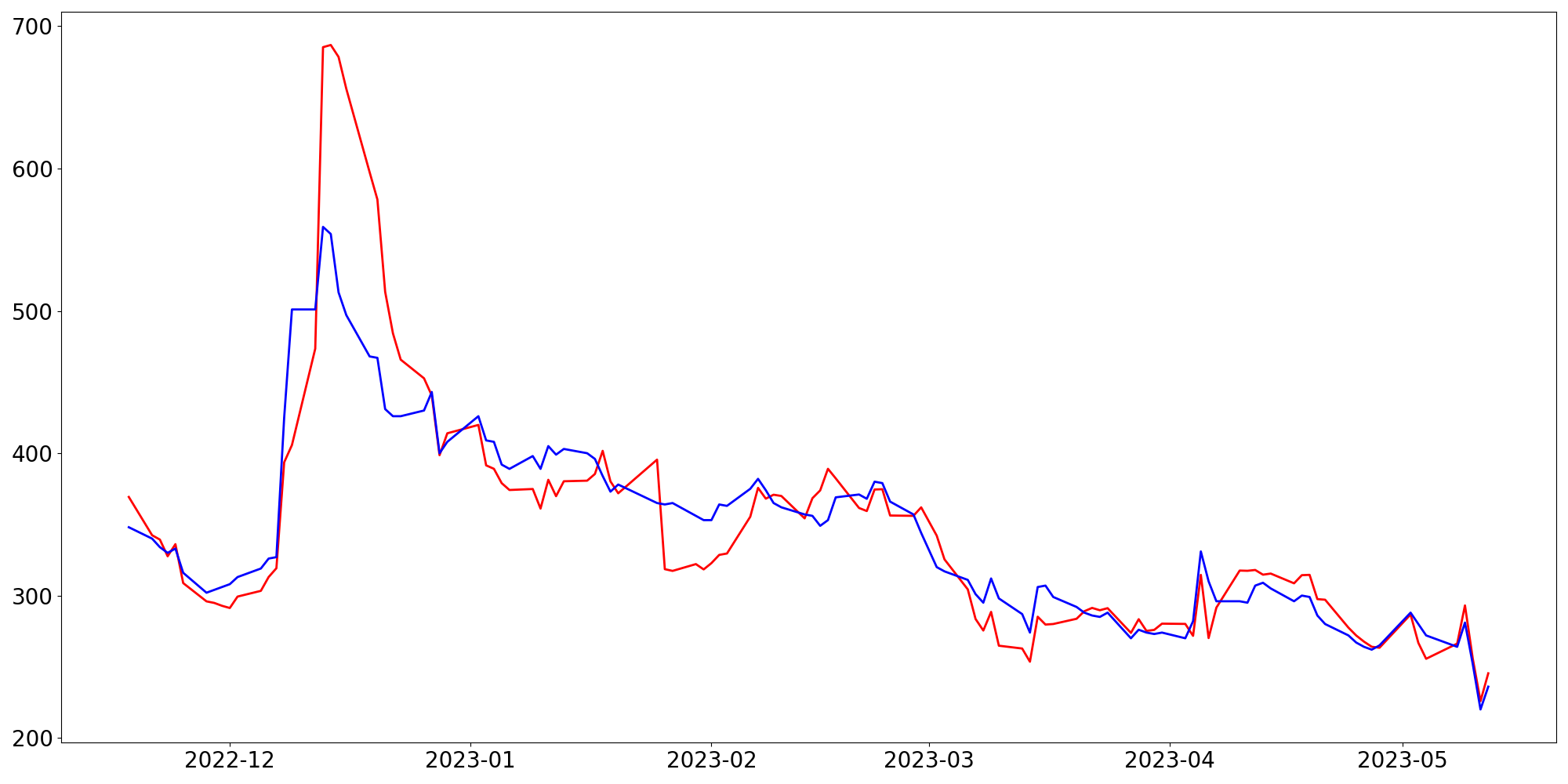 [ - : 실제값(종가) / - : 예측값(종가) ]
