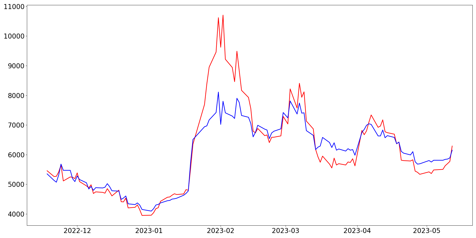 [ - : 실제값(종가) / - : 예측값(종가) ]