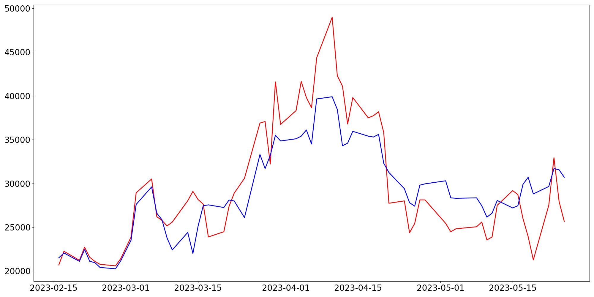 [ - : 실제값(종가) / - : 예측값(종가) ]