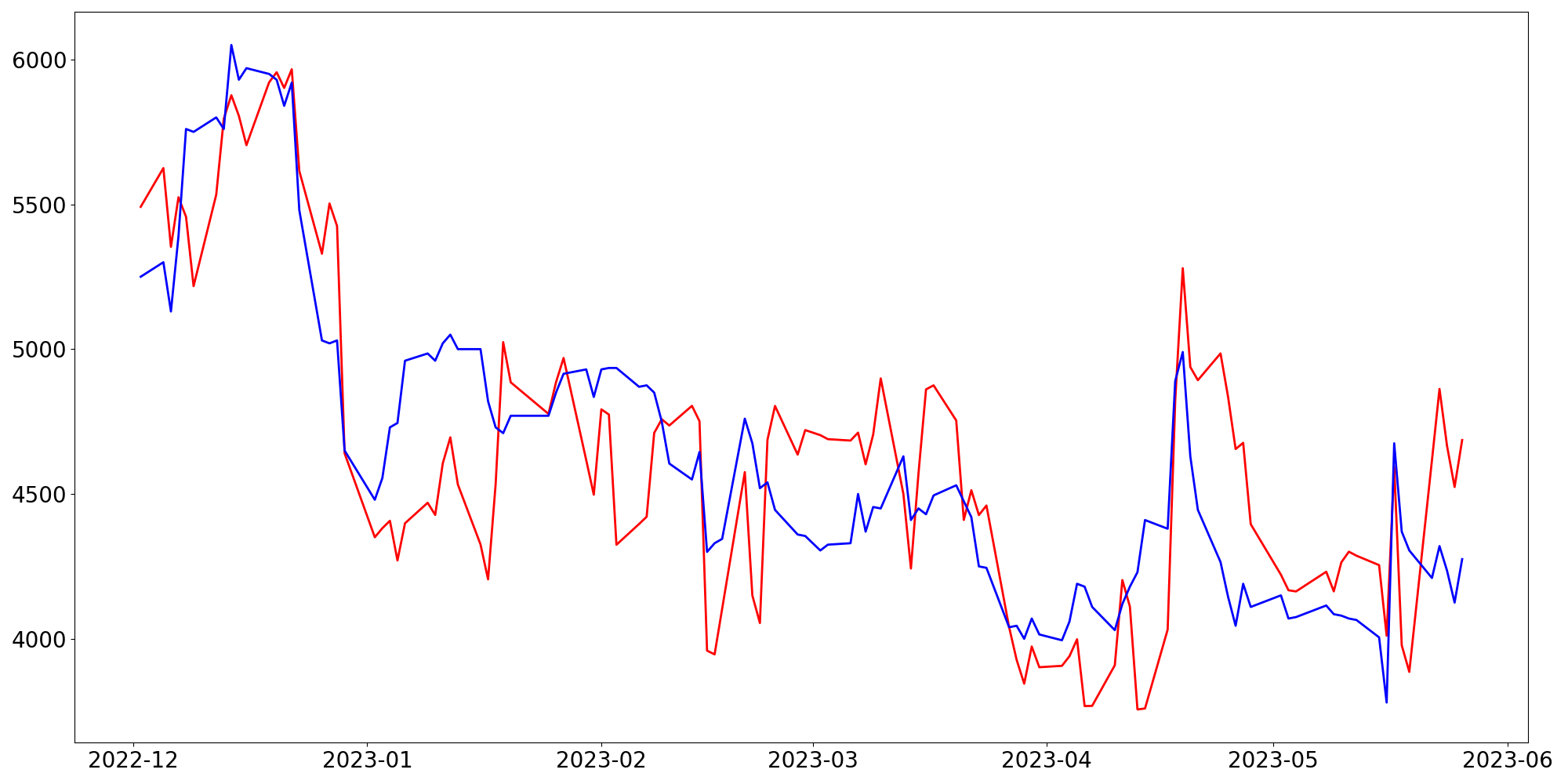 [ - : 실제값(종가) / - : 예측값(종가) ]