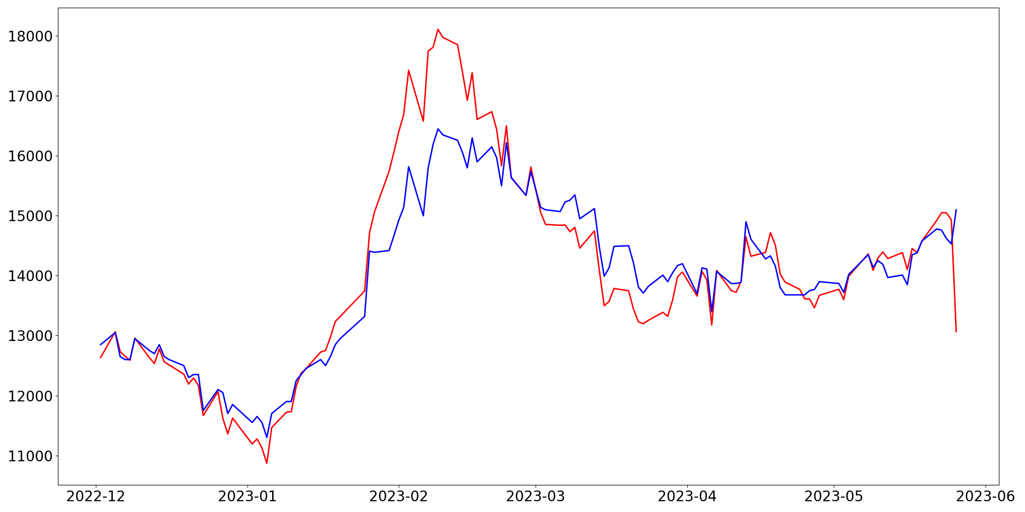 [ - : 실제값(종가) / - : 예측값(종가) ]