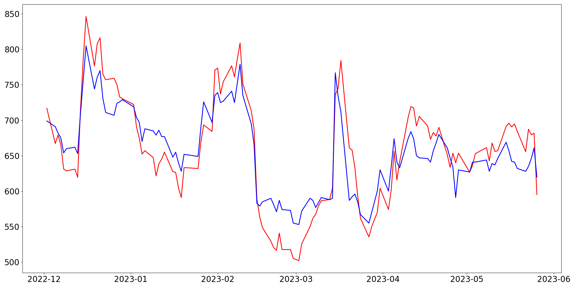 [ - : 실제값(종가) / - : 예측값(종가) ]