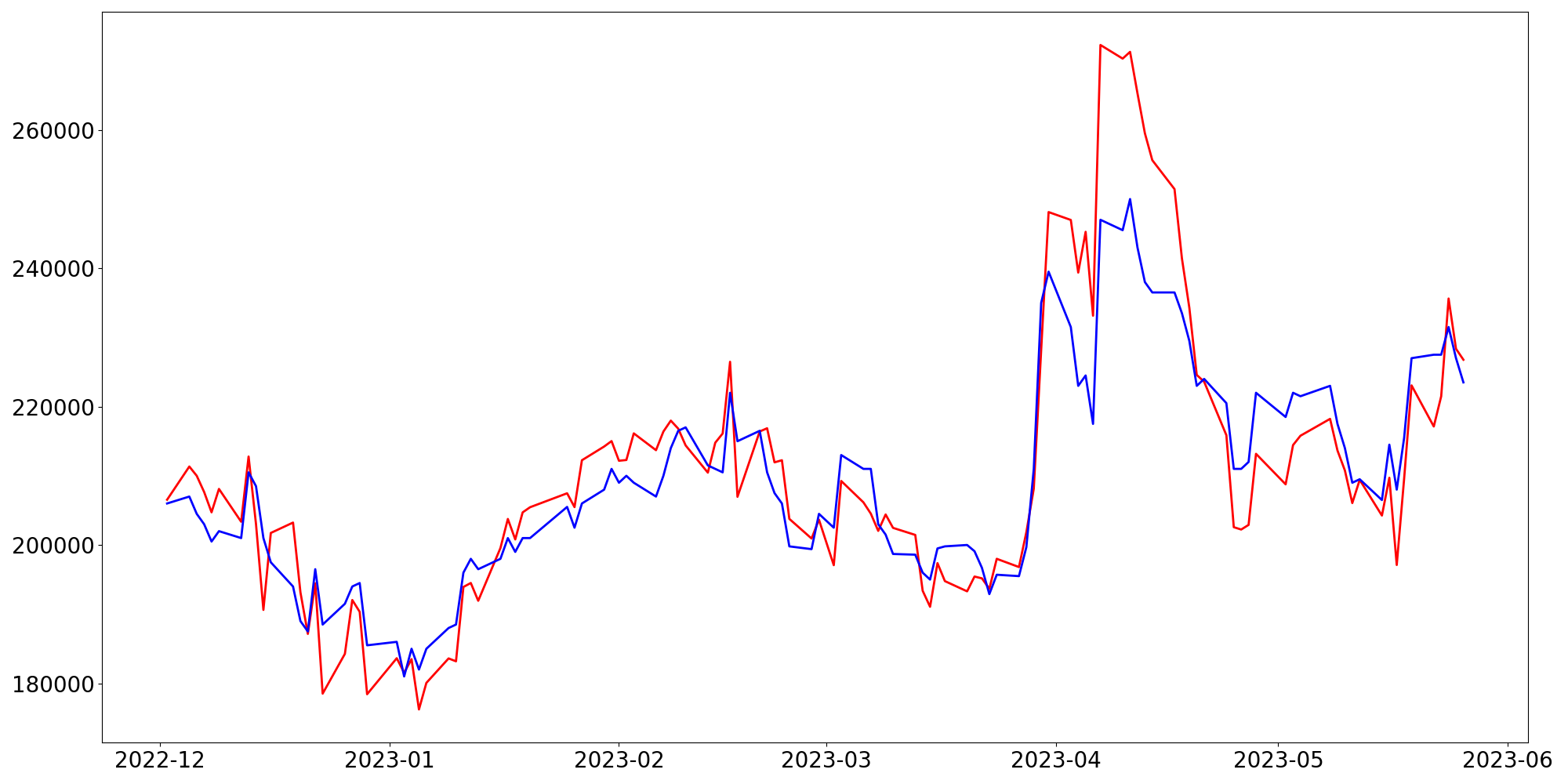 [ - : 실제값(종가) / - : 예측값(종가) ]