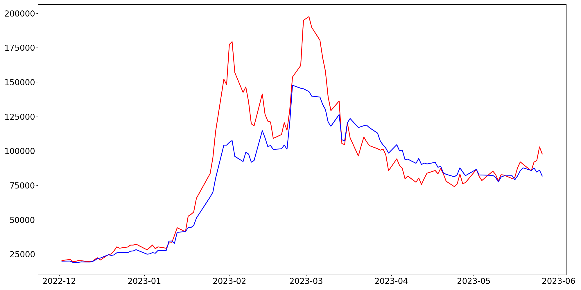 [ - : 실제값(종가) / - : 예측값(종가) ]