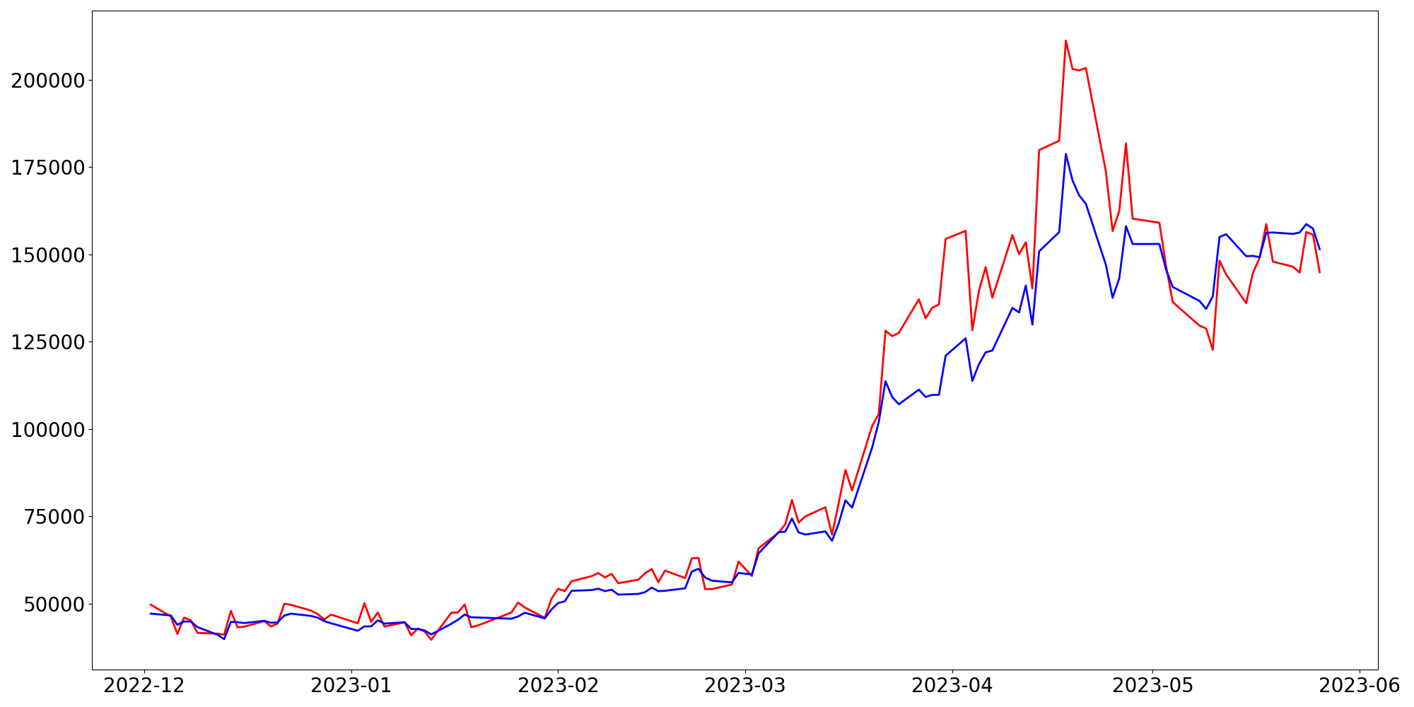 [ - : 실제값(종가) / - : 예측값(종가) ]
