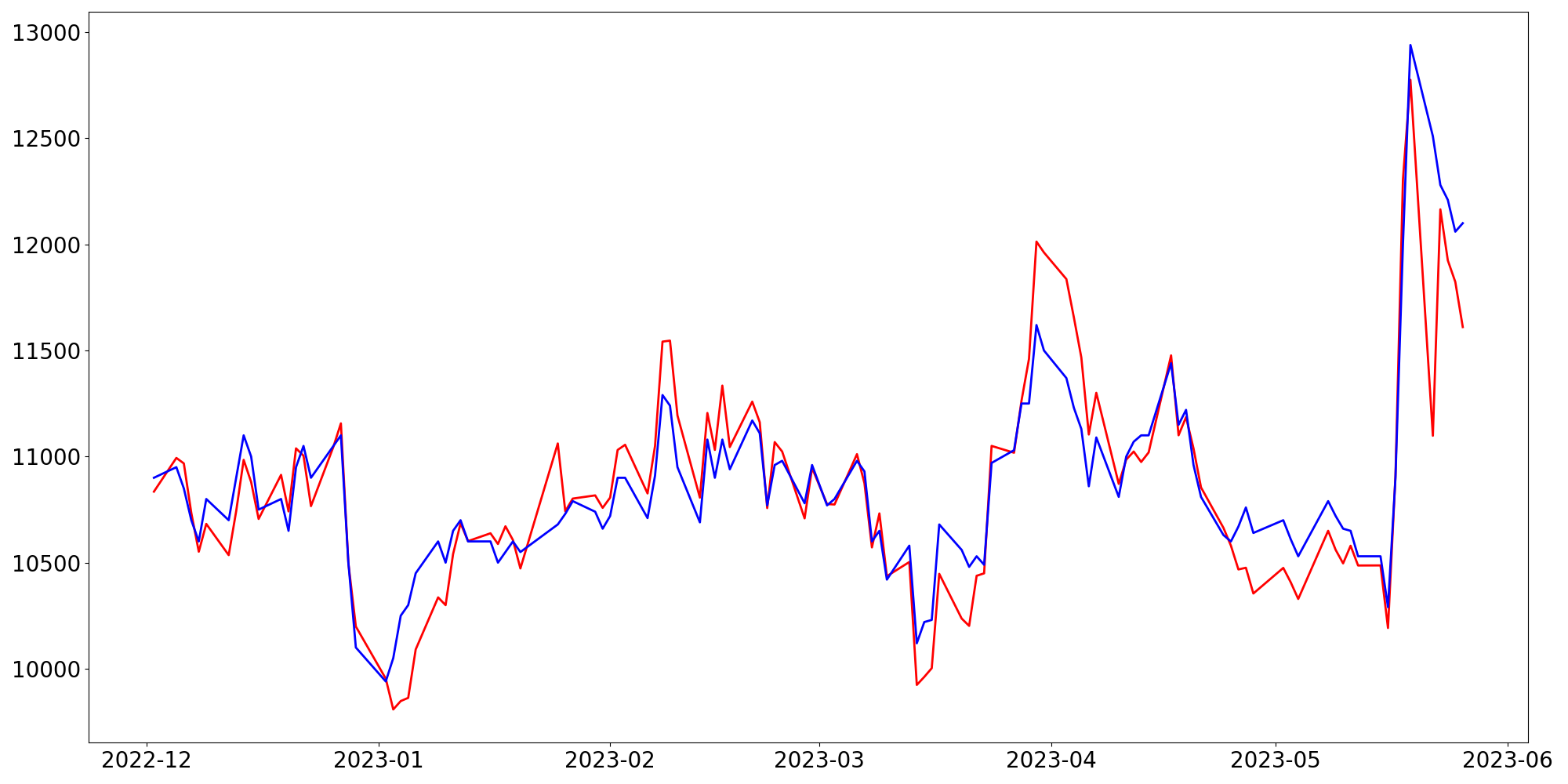 [ - : 실제값(종가) / - : 예측값(종가) ]
