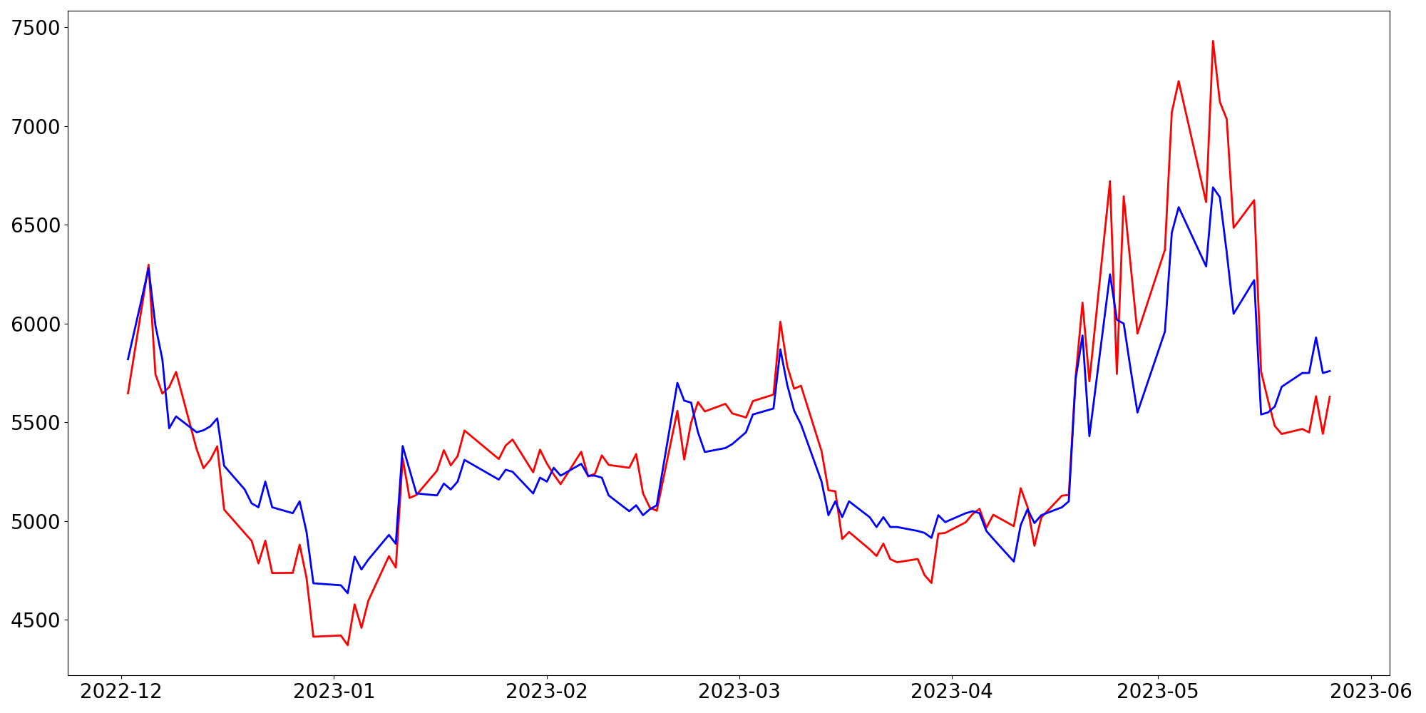 [ - : 실제값(종가) / - : 예측값(종가) ]